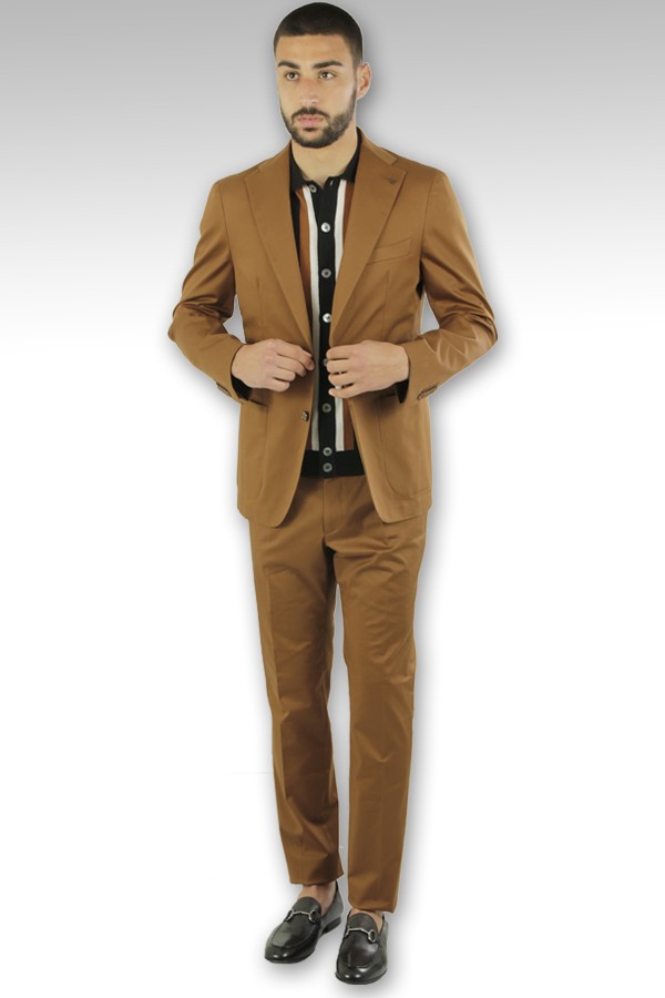 Tagliatore dress Art.AOX22K1179UEZ162 K1092 made of tobacco-colored cotton blend, oxford model lerary pine with two-button jacket and patch pockets, trousers with welt pocket and a pleat. Composition 97%co 3%ea. The model wears size 48.
