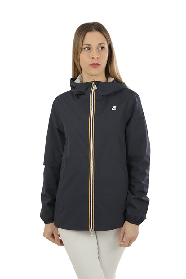 Marguerite model, made of stretch polyester with jersey lining. Non-detachable hood and heat-taped seams. Cuffs with elastic and adjustable bottom. Zip pockets and internal pocket. Regular fit.
