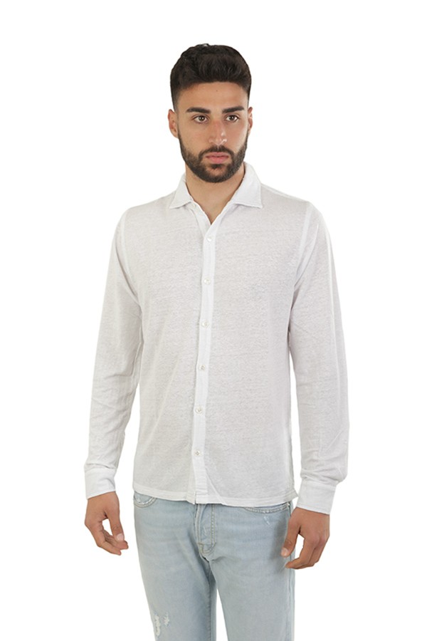 Jeordie's Poloshirt Art.80735 100 made of white linen, model with buttons and long sleeves. The model wears size 48.