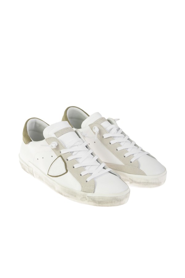Philippe Model Art.PRLUVX 20 sneaker with upper made of calfskin and white suede with contrasting green inserts, tone-on-tone logo shield with vintage-effect dirt. The lace is white with a worn effect. The sole, 2.5 centimeters high, is made of brushed rubber with a vintage effect.