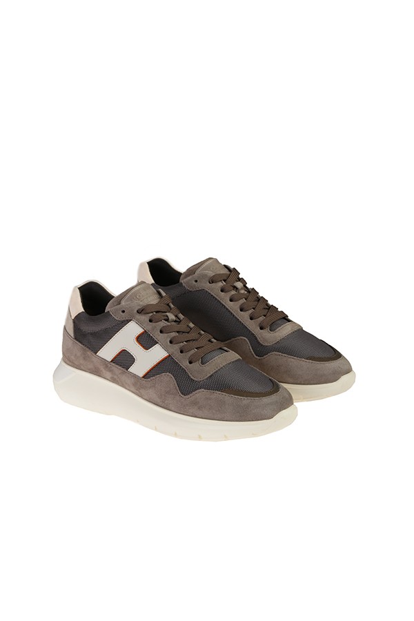 Interactive3 model, with suede upper, and technical fabric inserts. H òaterale in smooth leather, memory foam fussbett, 5.3cm high rubber sole. Additional laces.