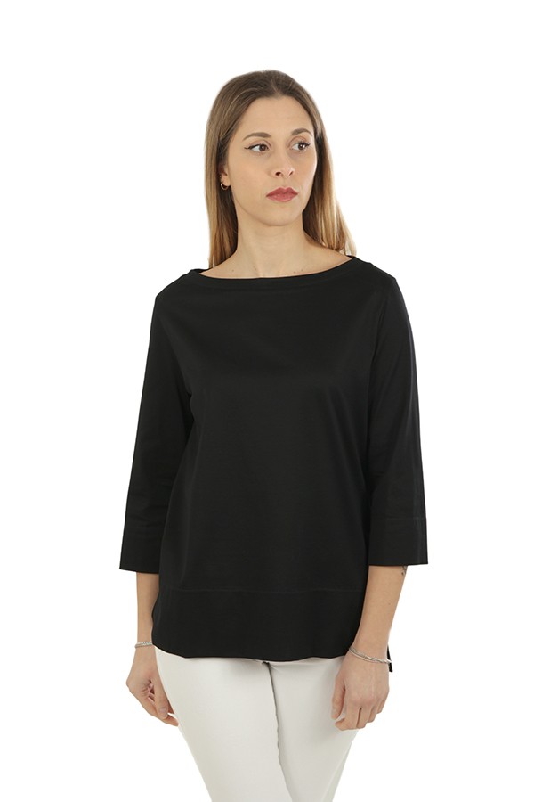 Made of cotton, with boat neckline and three-quarter sleeves. Side slits.