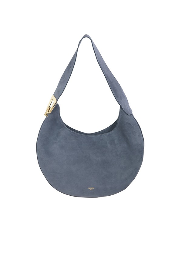 Realizzata in suede, dalla forma a mezza luna, da portare a spalla. Con dettaglio oro. Chiusura con zip, taschino interno.