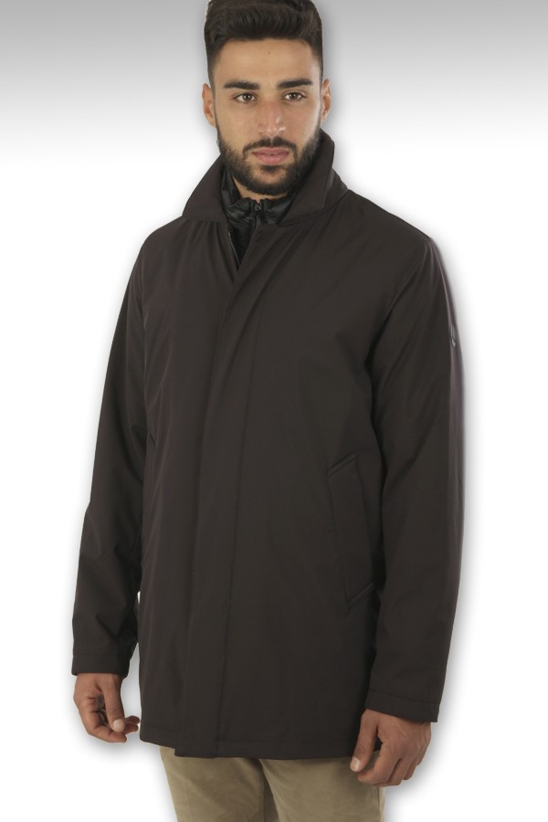 Giaccone People Of Shibuya Art.HOKKAIDO PM766 290 realizzato in tessuto tecnico colore marrone, piumino interno completamente staccabile con imbottitura ecologica, chiusura con zip, tasca a filo. Il modello indossa taglia 48.