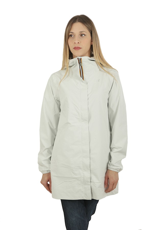 Modello Sophie Stretch Dot, lunghezza tre quarti, vestibilità slim. Realizzato in poliestere riciclato, impermeabile e traspirante, con cappuccio regolabile. Interno logato con tasca. Cuciture termonastrate. Chiusura con zip e pattina, polsi con elastico, due tasche con zip, logo stampato.