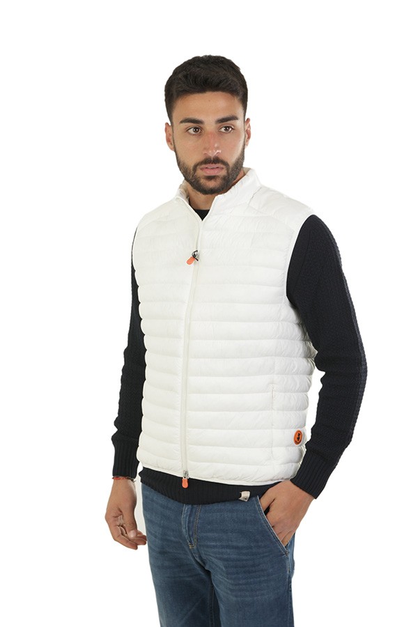 Gilet Save The Duck Art.D82410M GIGA16 00002 Adamus colore bianco, combina il leggero design trapuntato con il colletto alla coreana, rifinito in Lycra su fondo e giromanica, il modello presenta chiusura a doppio cursore e tasche laterali chiuse da zip, tirazip personalizzato color arancio e imbottitura animal-free in Plumtech