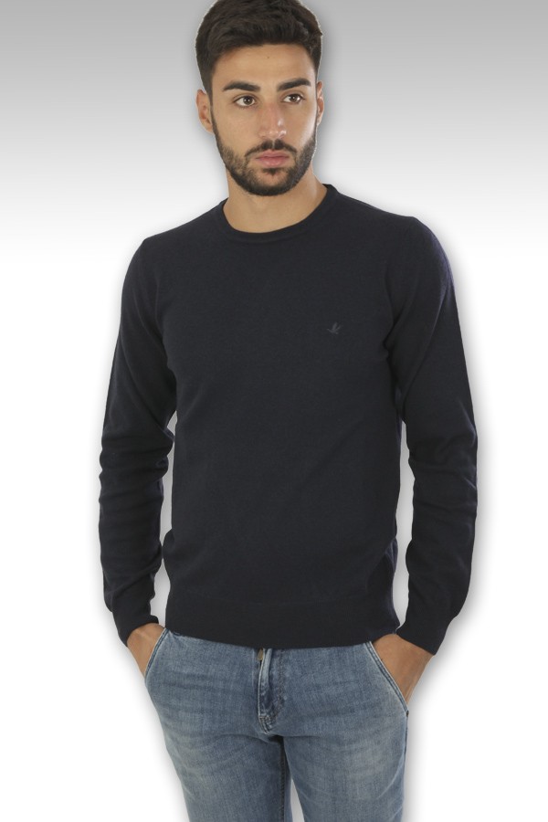 Maglia Brooksfield Art.K001 0176 realizzata in lana jersey colore blu modello girocollo, logo ricamato sul petto a contrasto. Composizione 100%wv. Il modello indossa taglia L.