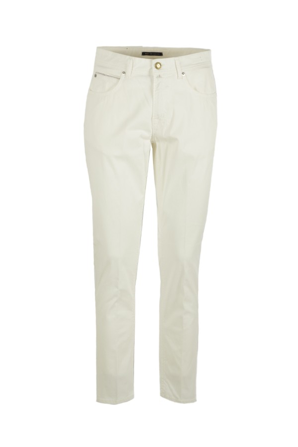 Modello cinque tasche in misto cotone, color Panna. Chiusura con zip e bottone.