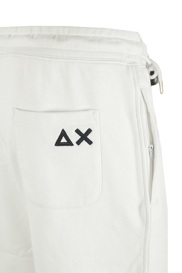 In fleece, with elastic and drawstring at the waist, slanted pockets.