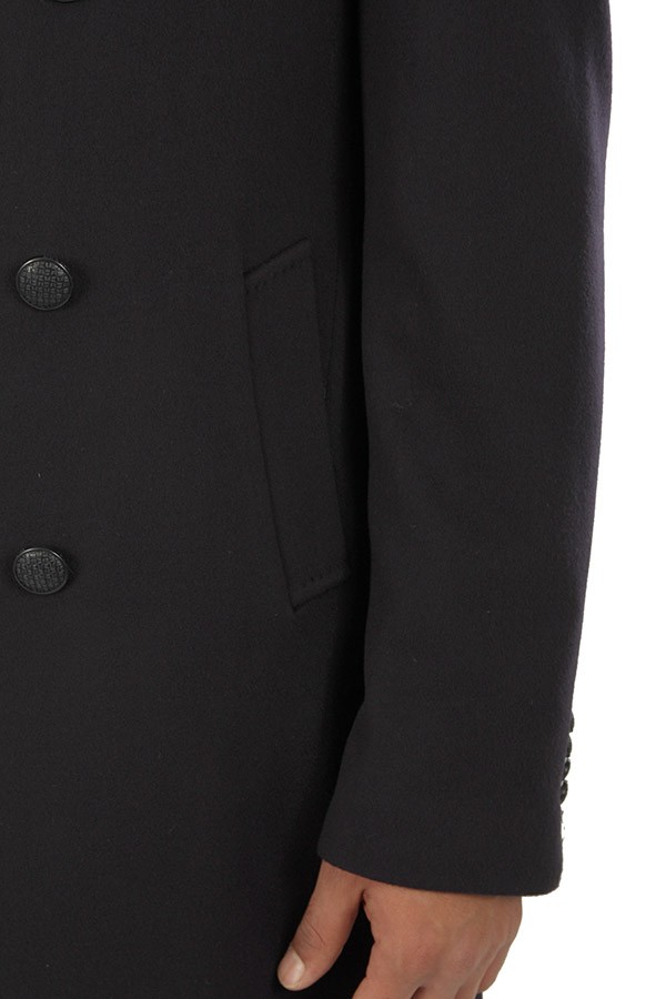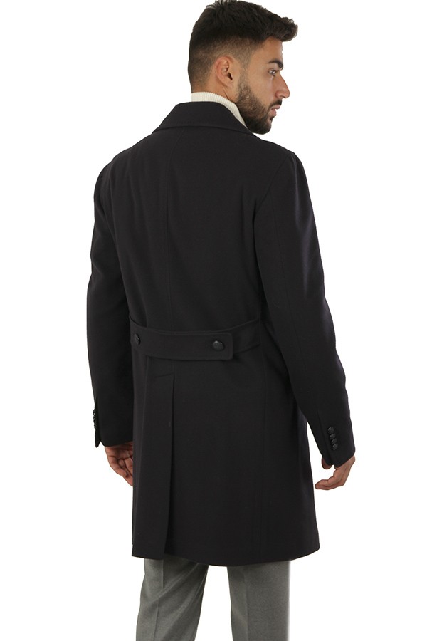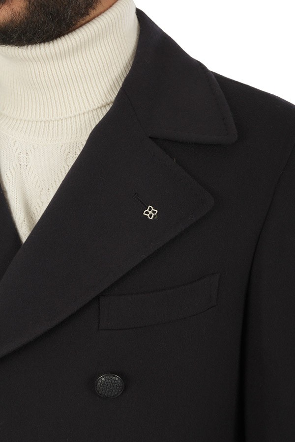 Coat TAGLIATORE Art.ARDEN350001B5054 1254 double-breasted model made of blue wool and cashmere blend, with martingale and central slit, welt pocket. Composition 90% 10% cashmere. The model wears size 48.