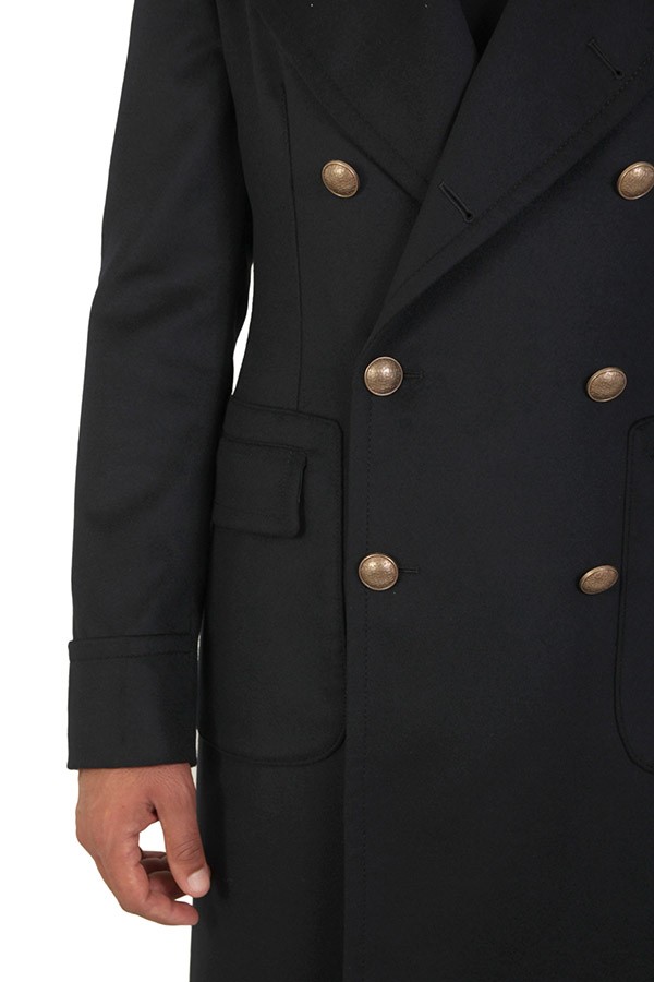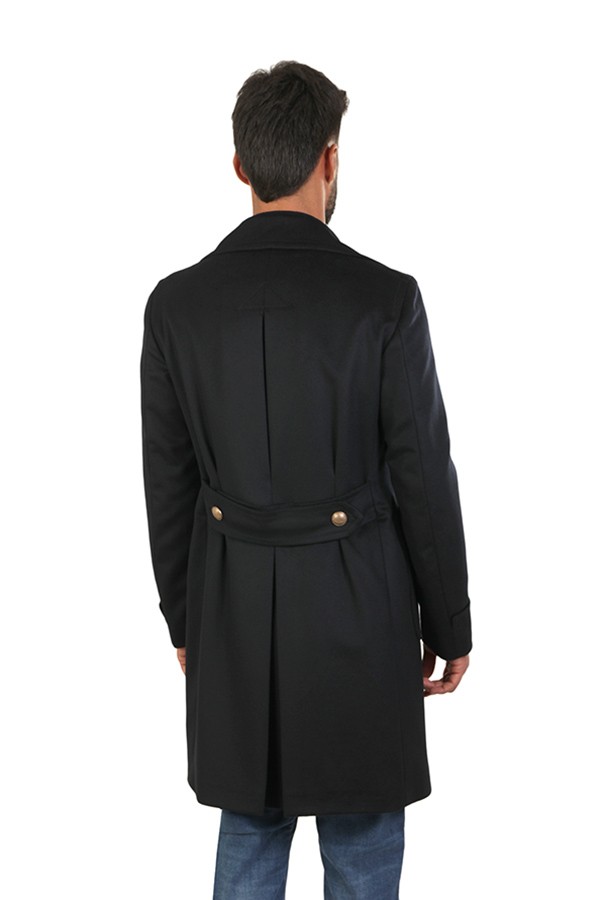 Double-breasted, with metal buttons. Medium length, with martingale. Patch pockets with flap.