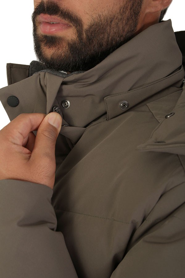 Made with a mix of materials, stretch, which makes it comfortable. It has a detachable hood and fleece inside of the collar.