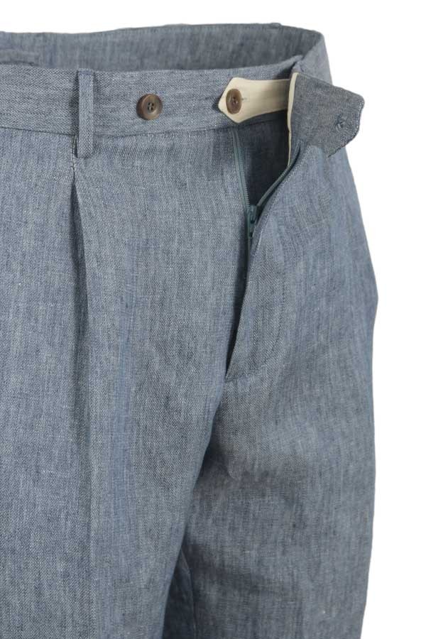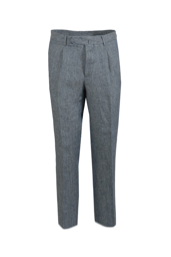 Made of linen. Single-breasted jacket, with patch pockets. Trousers with pleats, and back pockets with flap and button.