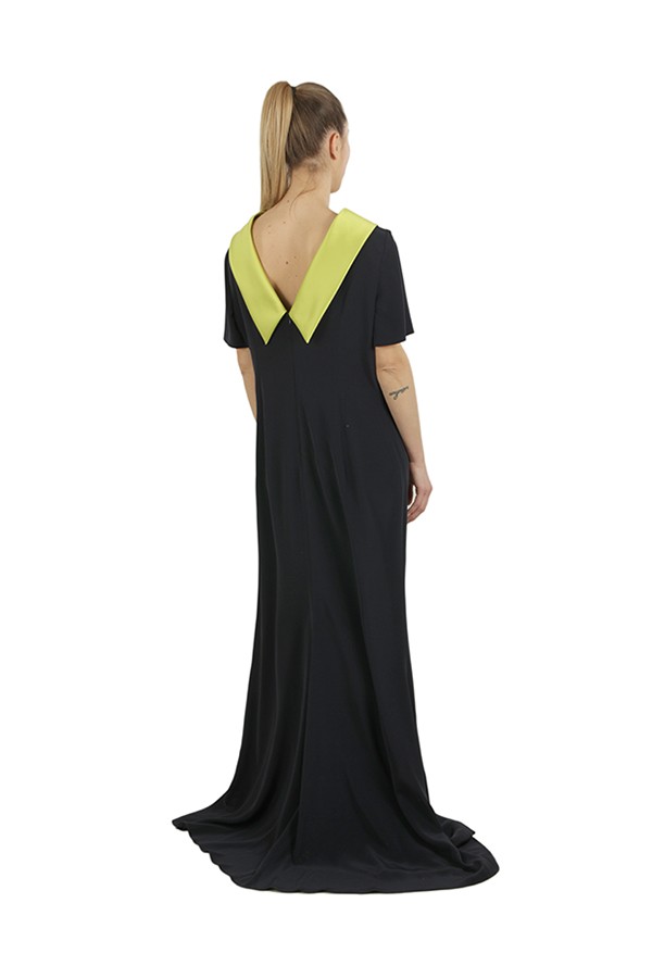 Made of cady, with a semi-mermaid line. Original V-neck on the back.