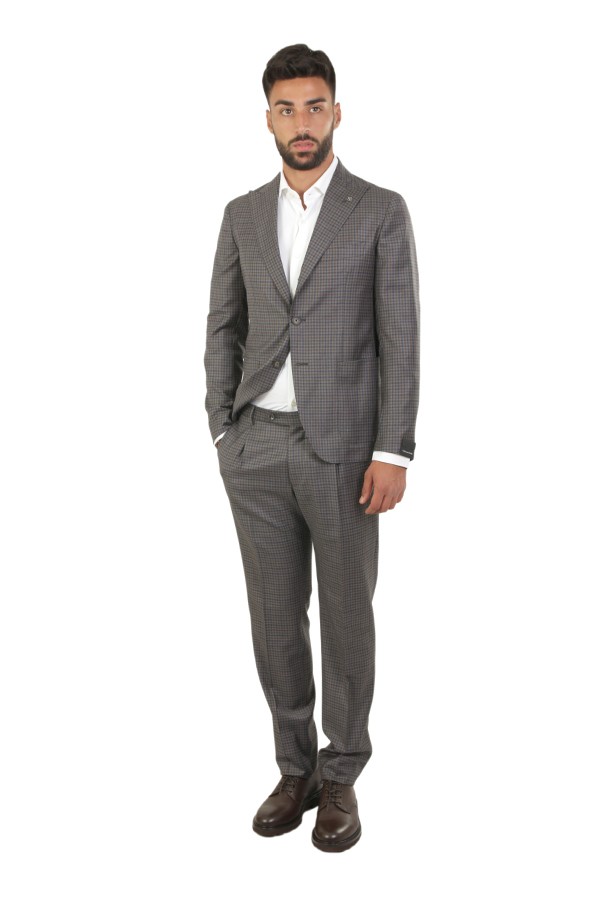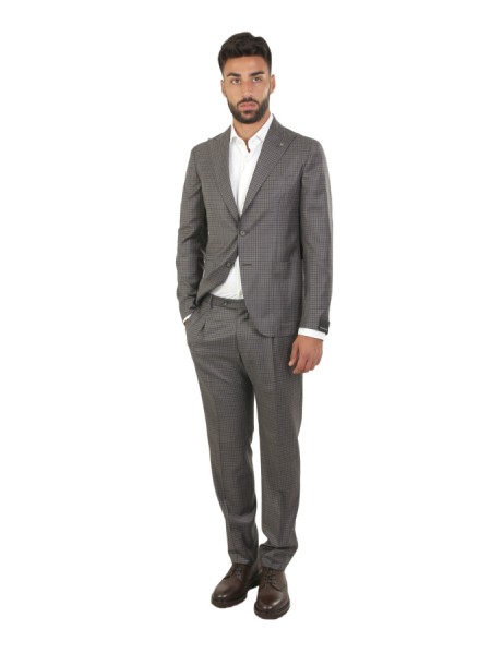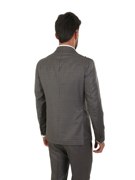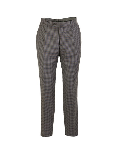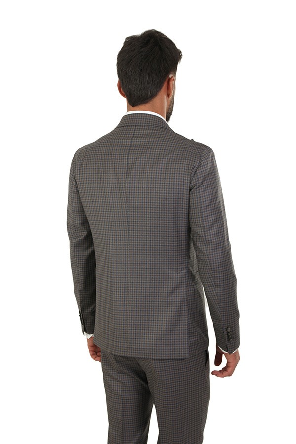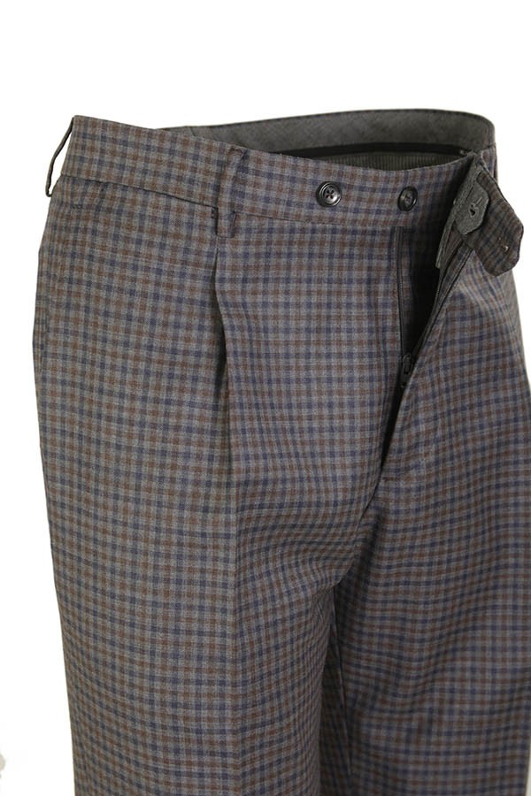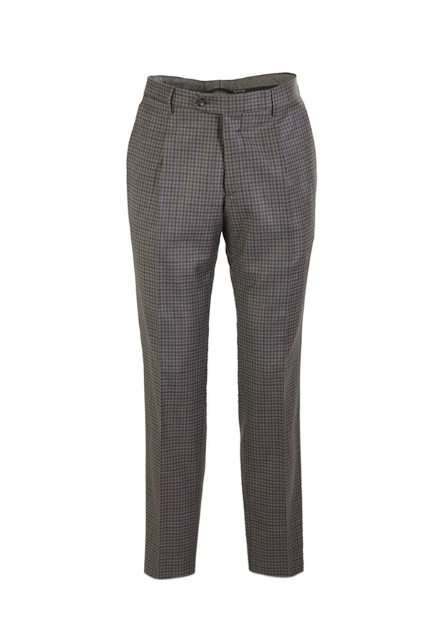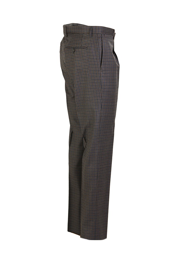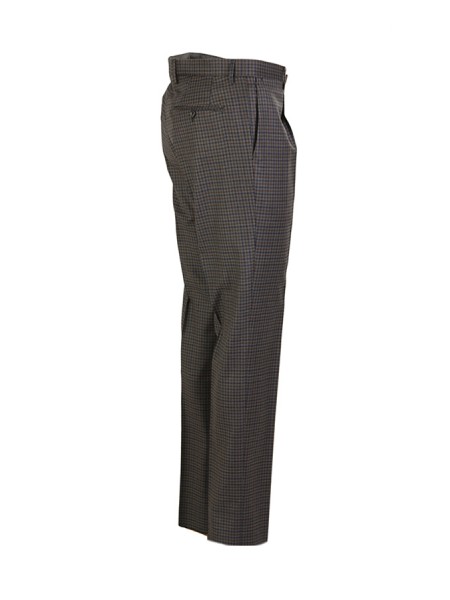 Dress made of wool. Jacket with peak lapels, patch pockets. Trousers with pleats. In checkered pattern.