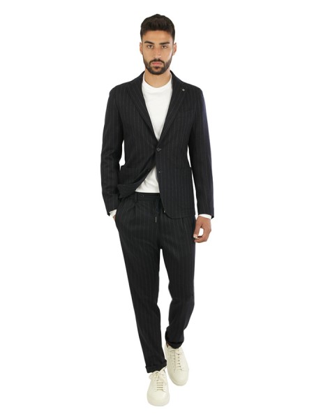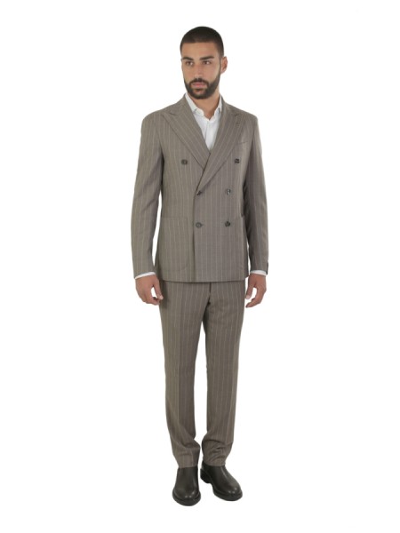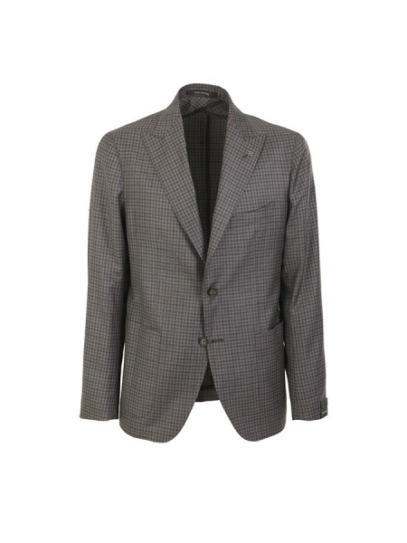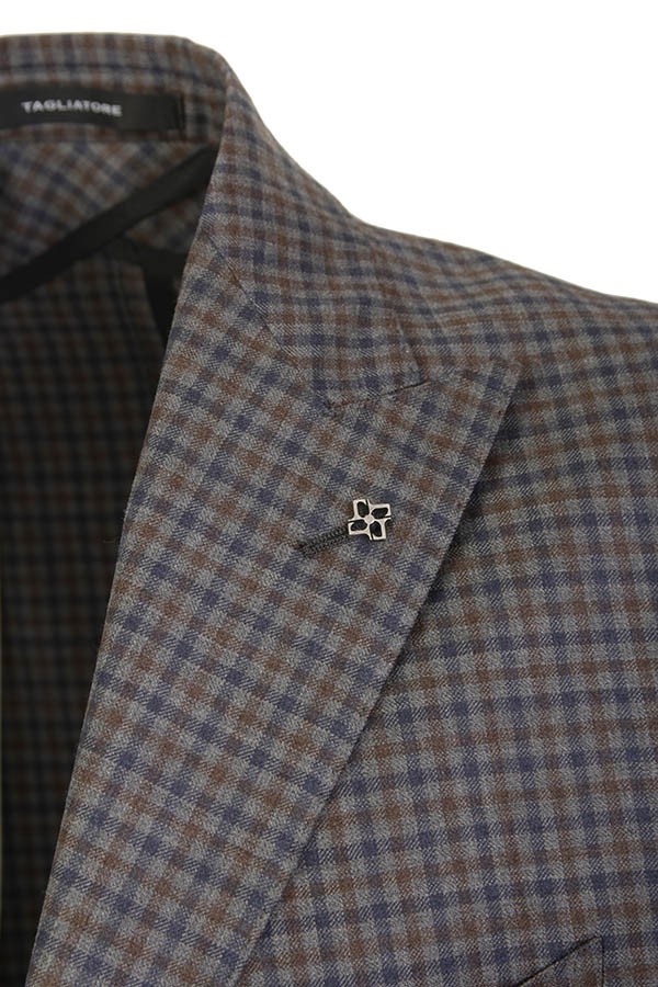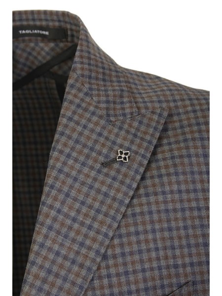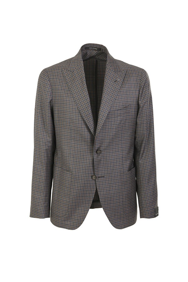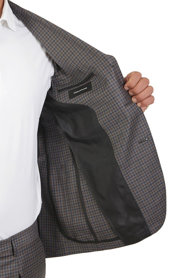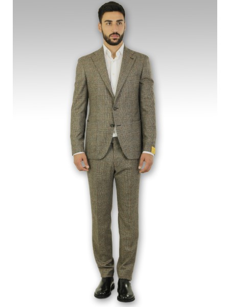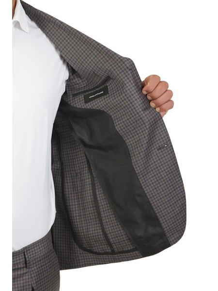 Dress made of wool. Jacket with peak lapels, patch pockets. Trousers with pleats. In checkered pattern.