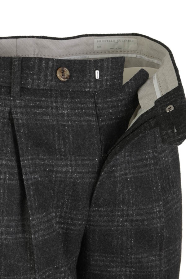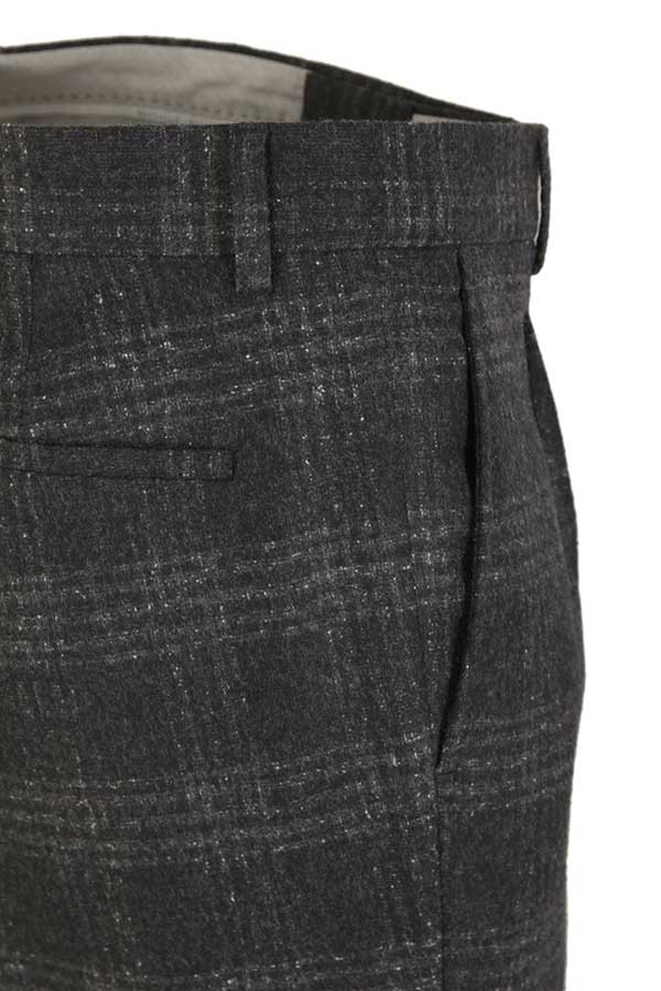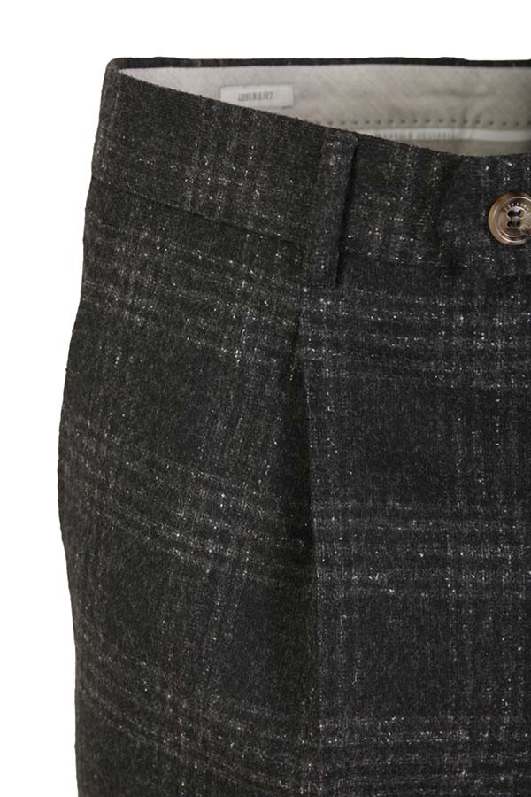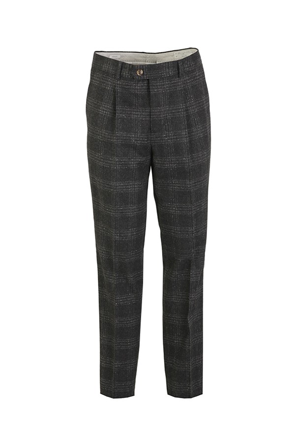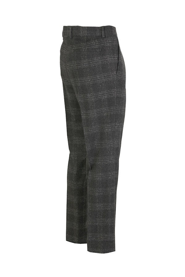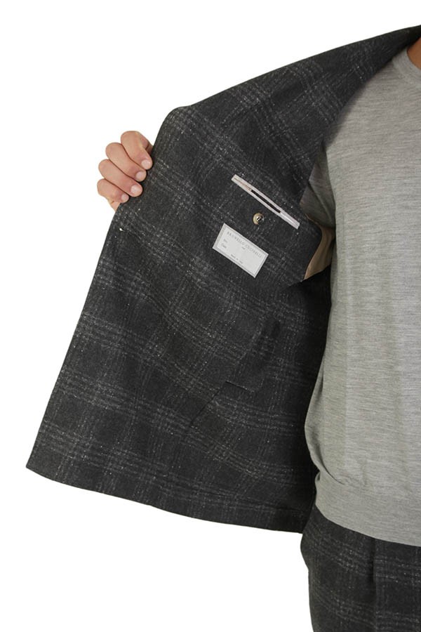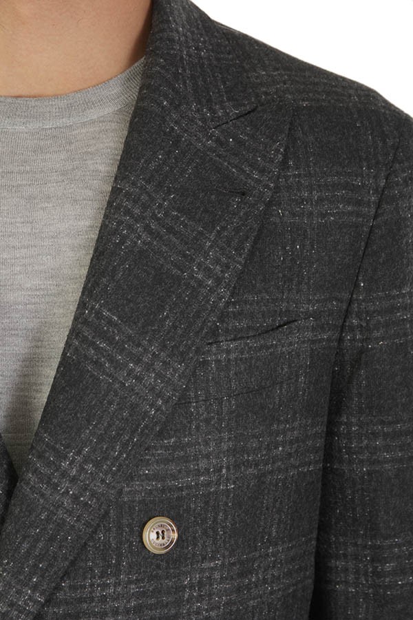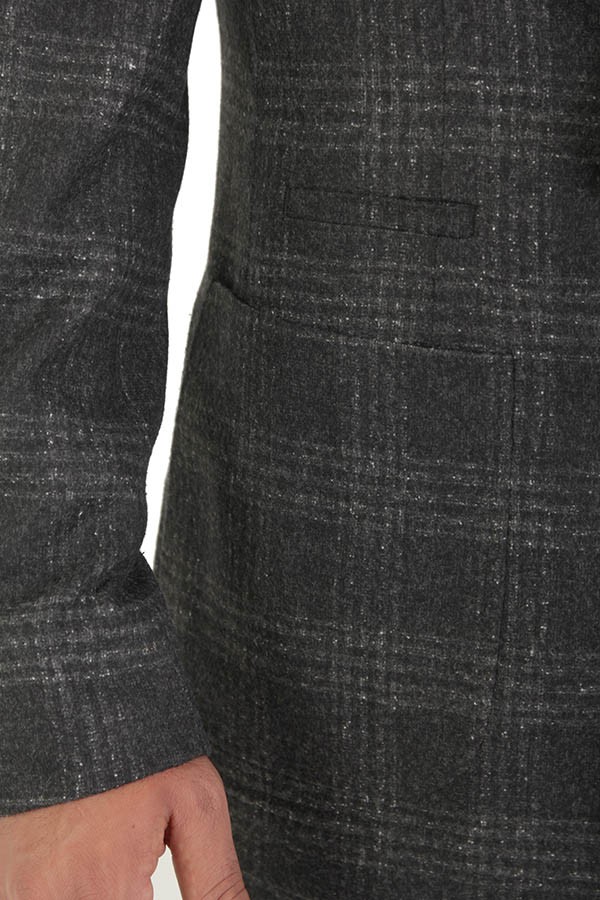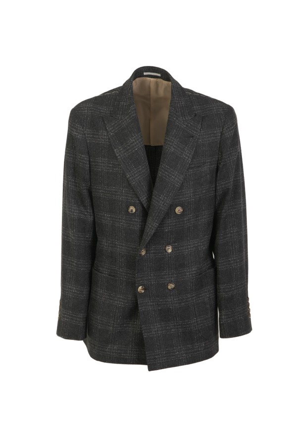 Double-breasted model, in Prince of Wales. With patch pockets.