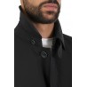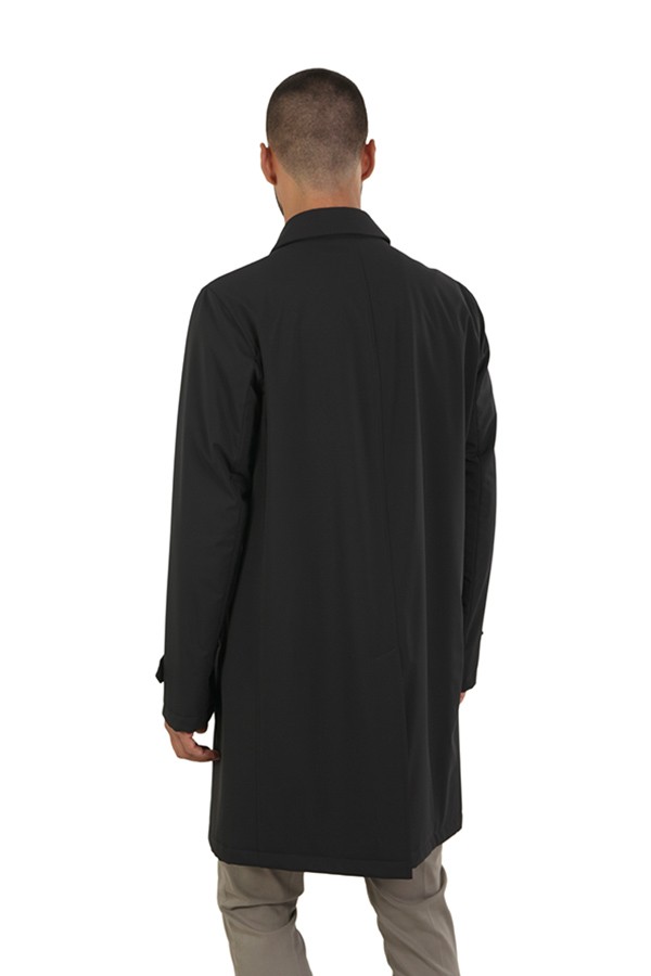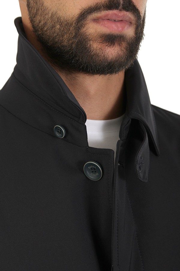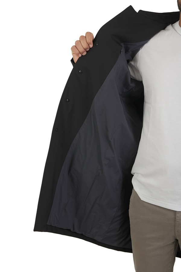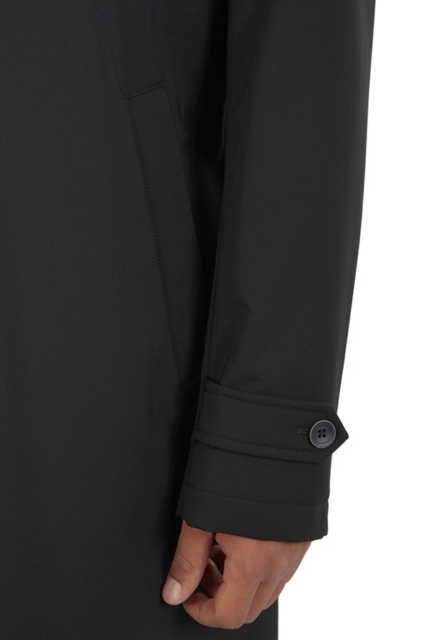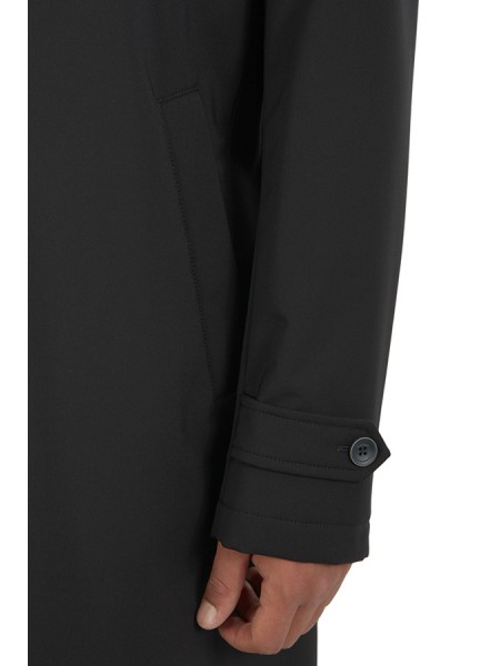 Made of technical fabric, welt pockets, with collar. Hidden closure.