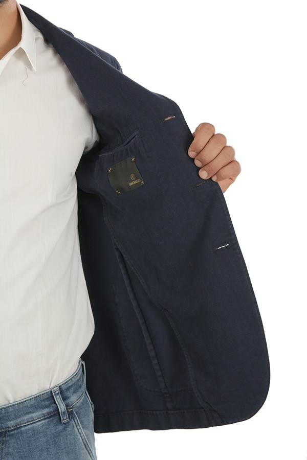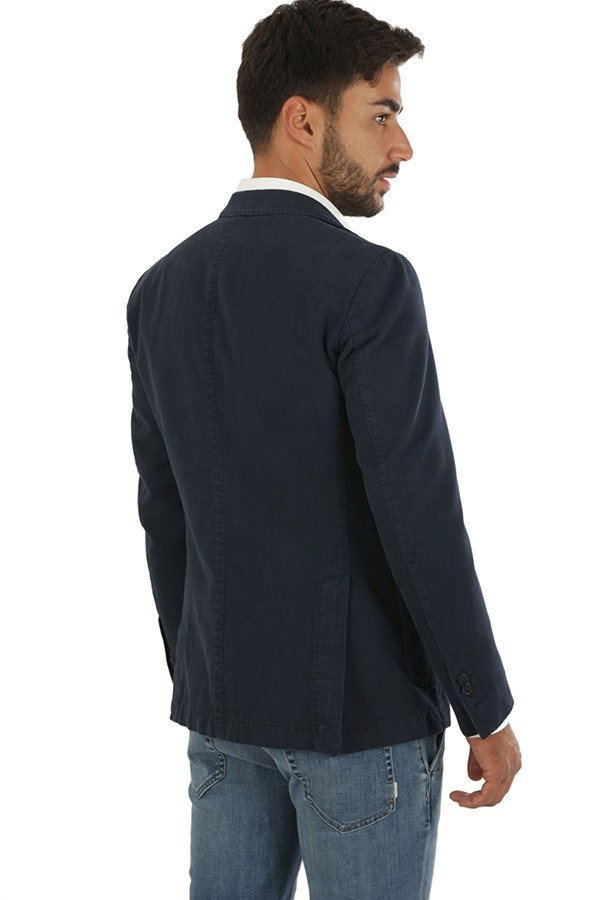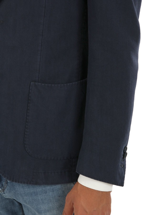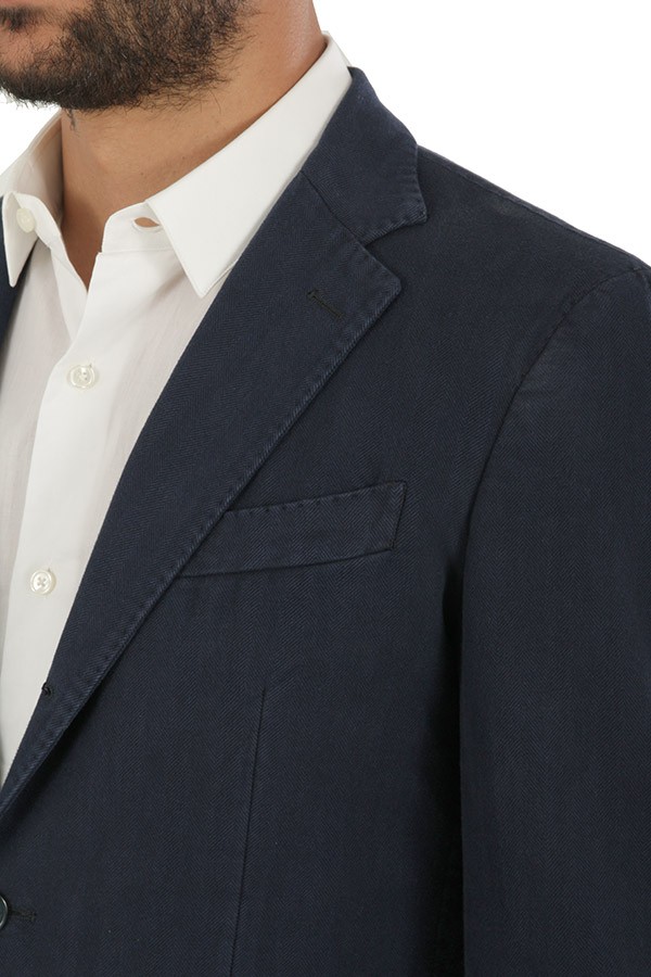Santaniello jacket Art.GL729MF TDS1269 78B made of herringbone blue wool blend, model d.7 two buttons with patch pockets. Composition 75%wo 15%pa 10%pl. The model wears size 48.