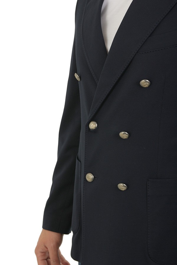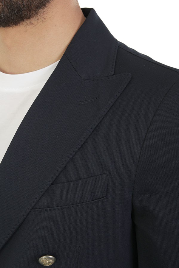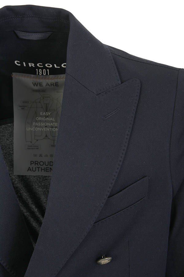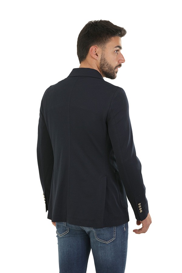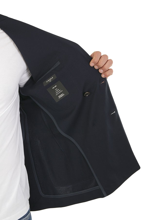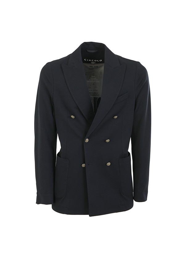 Circolo jacket Art.CN3819 447 made of navy blue cotton pique blend, double-breasted model with patch pockets and silver-finish buttons. Composition 97%co 3%elastane. The model wears size 48.