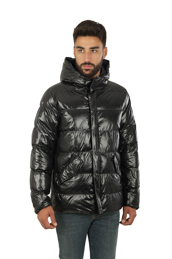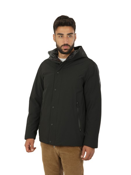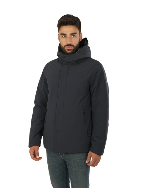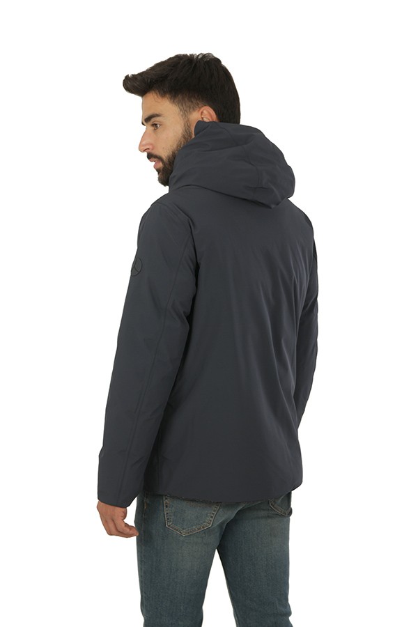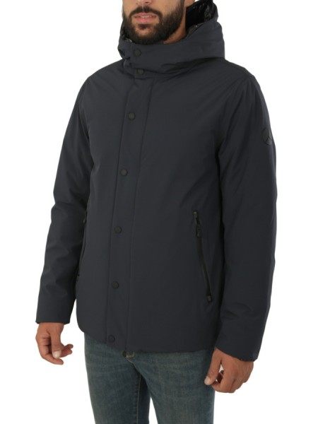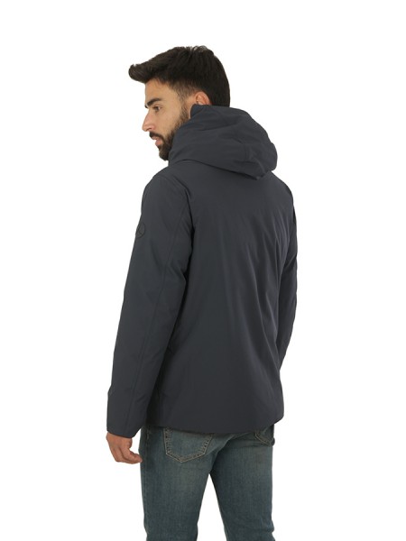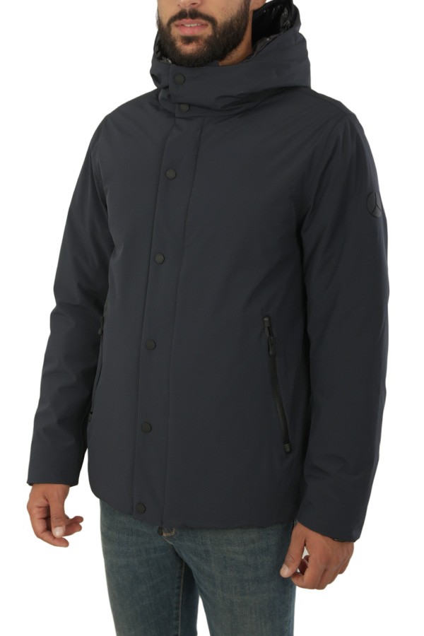Kore jacket, Navy/black, in technical fabric, reversible, padding in insulating technical material with hood. Double-slider zip and personalized rubber. Rubberized logo on the left sleeve. Flap pockets with magnetic closure system.