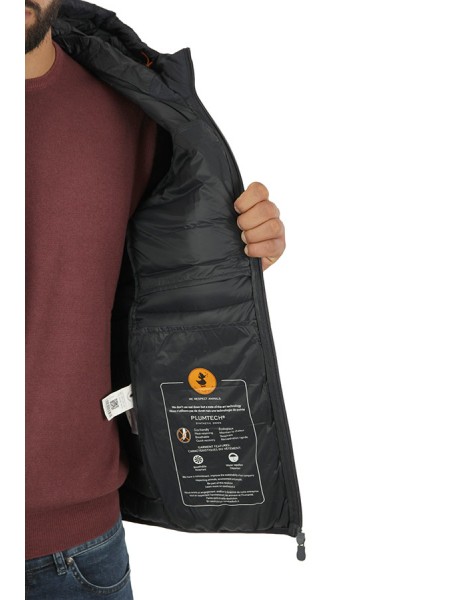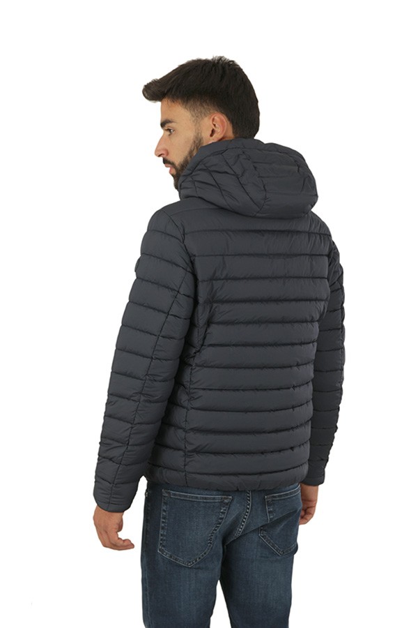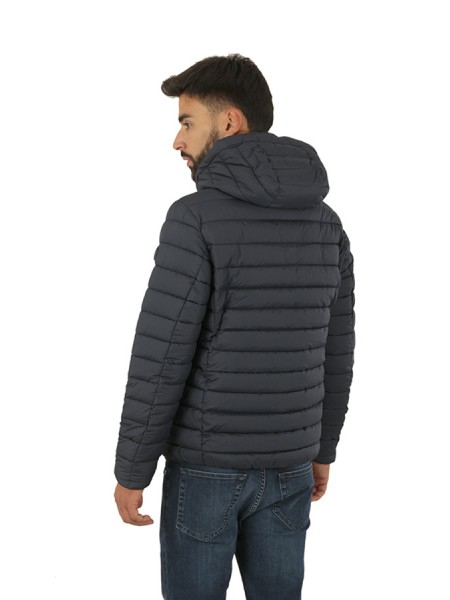 Juncus SAVE THE DUCK jacket, in technical fabric in blue/black. Quilted with front zip closure, logo on the sleeve. With hood, pockets and zip pocket.