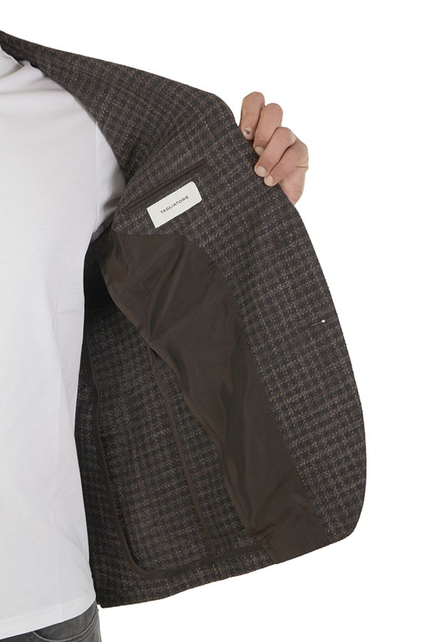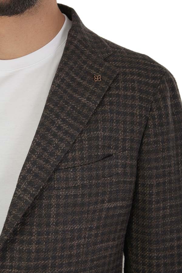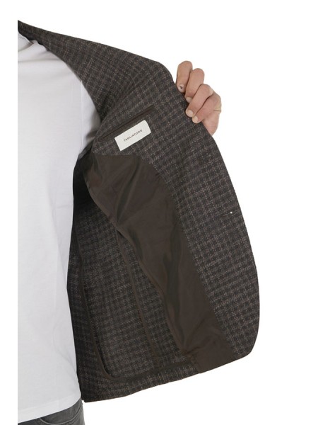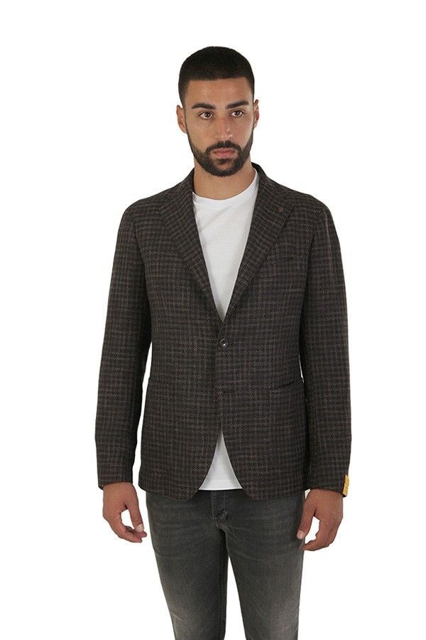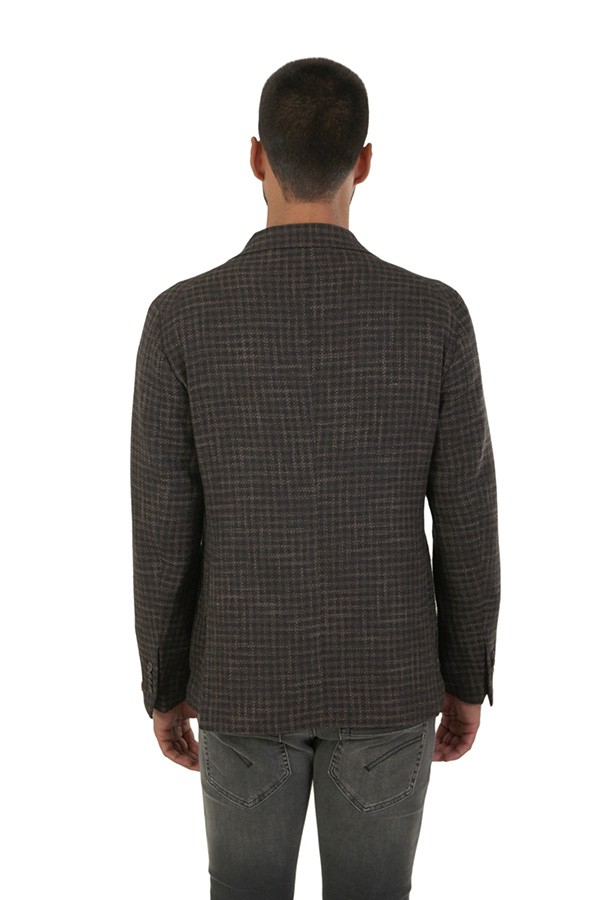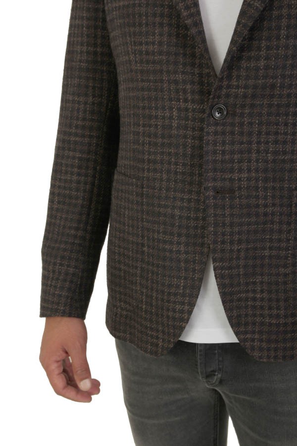 Montecarlo jacket, single-breasted in wool. In checked pattern, with boat pocket and front patch pockets.