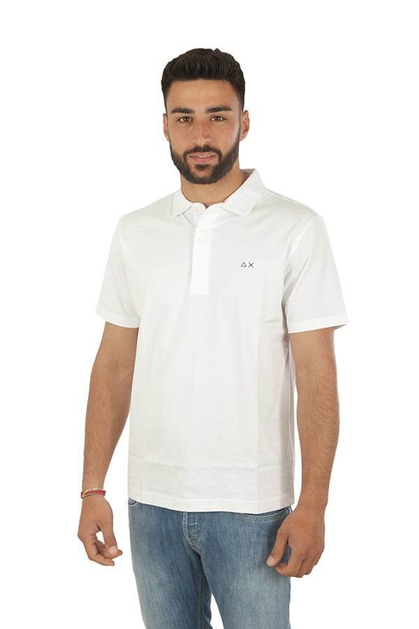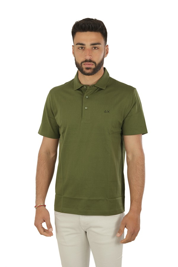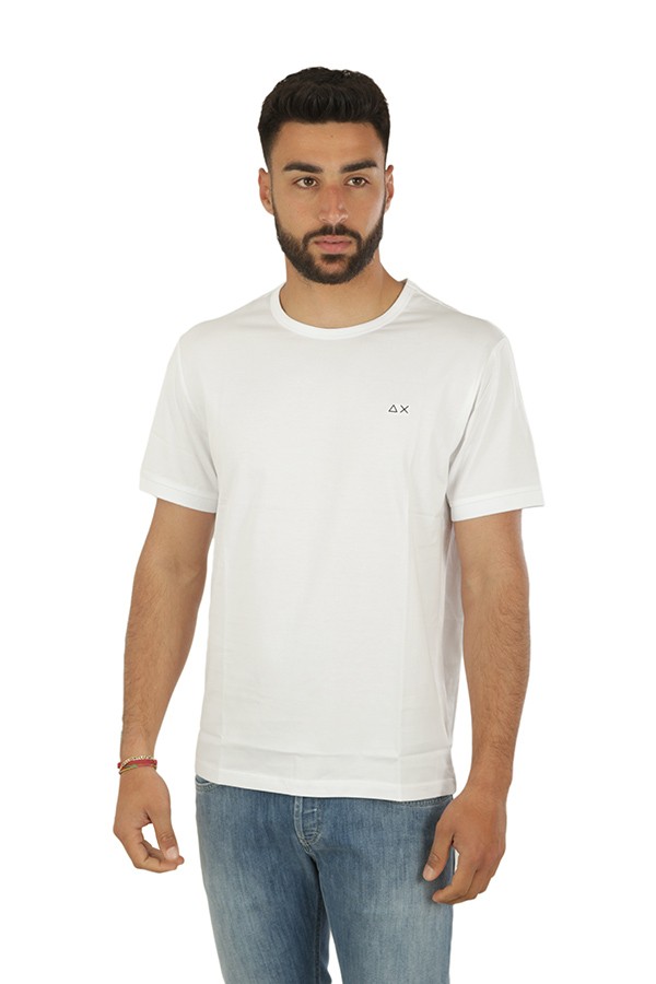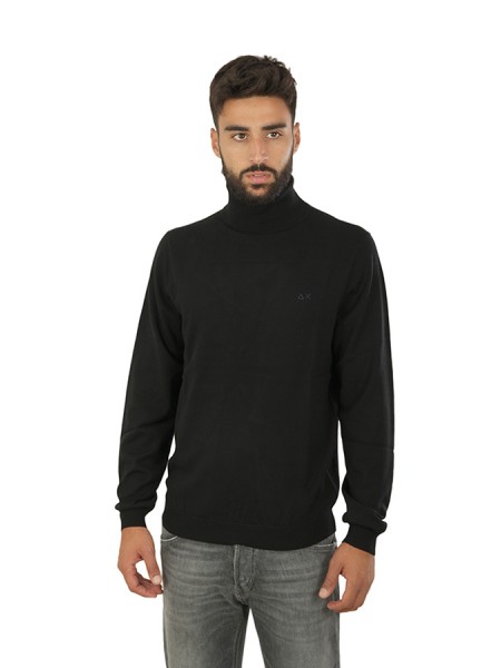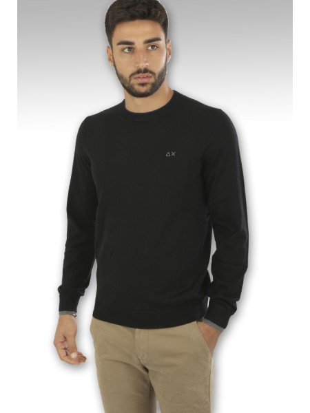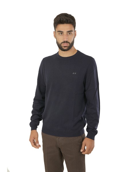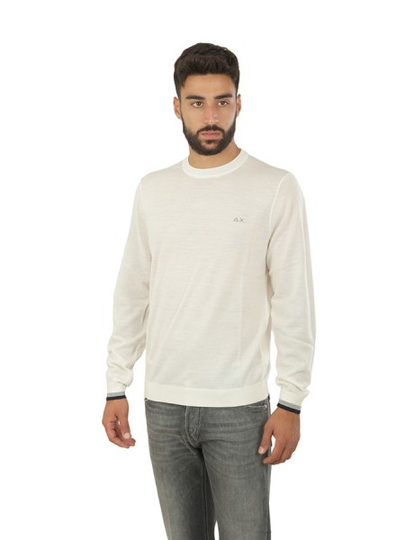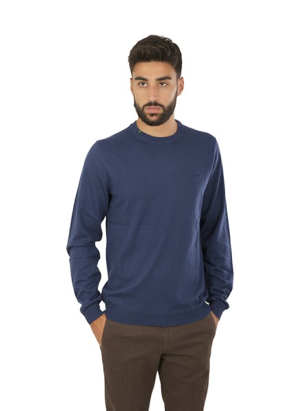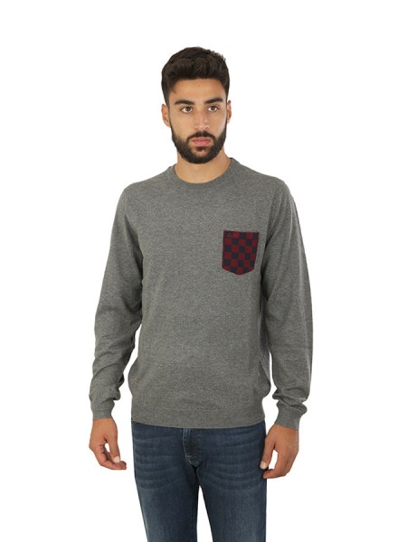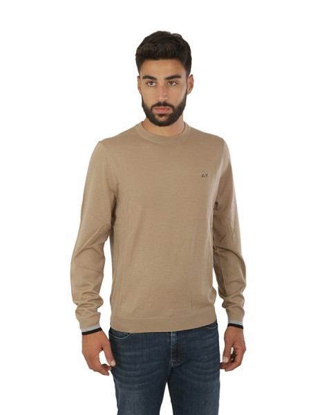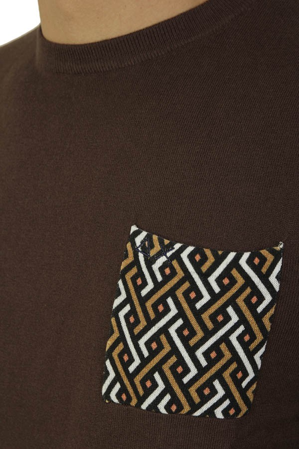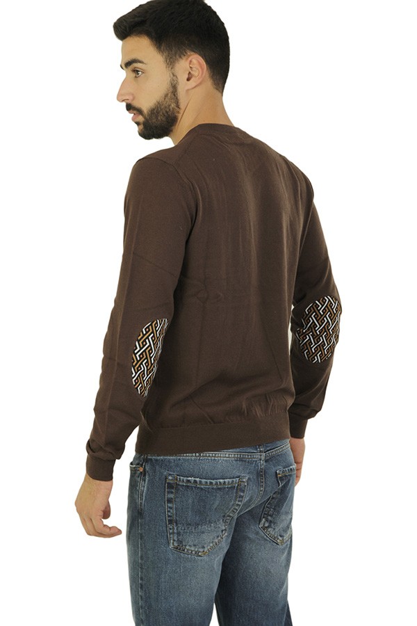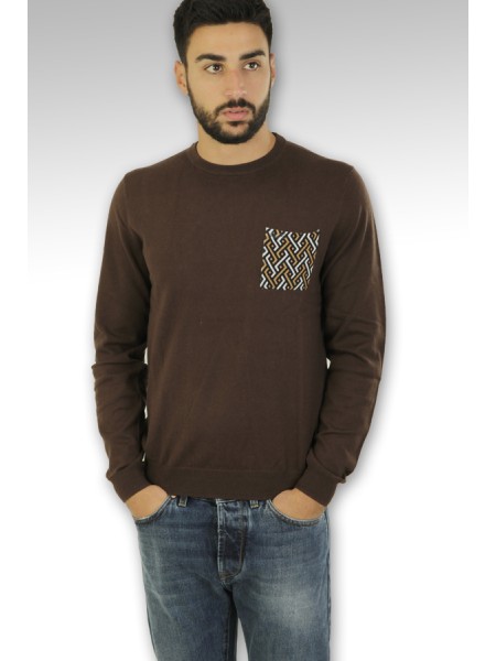 Sun68 sweater Art.K41113 08 elbow and pocket print crewneck model made of brown wool, patterned pocket detail, logo on the chest. The model wears size M.