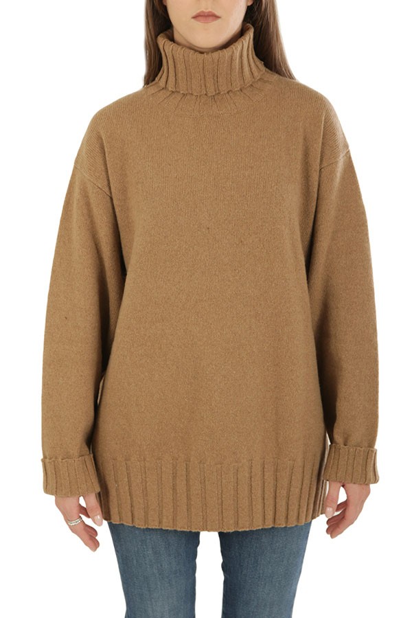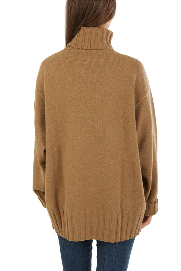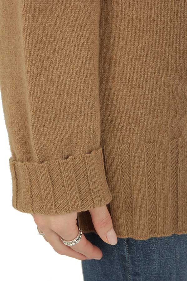 Malo sweater Art.DXC133 F1B94 E1664 made of cork-colored cashmere, turtleneck model, with ribbed knit on the bottom. Composition 95%ws 5%wo. The model wears a size 42.