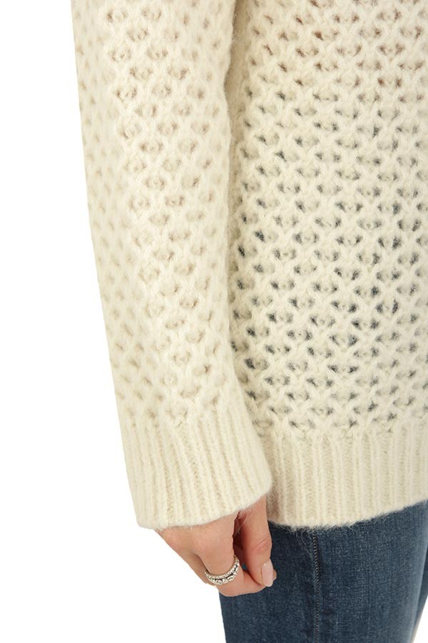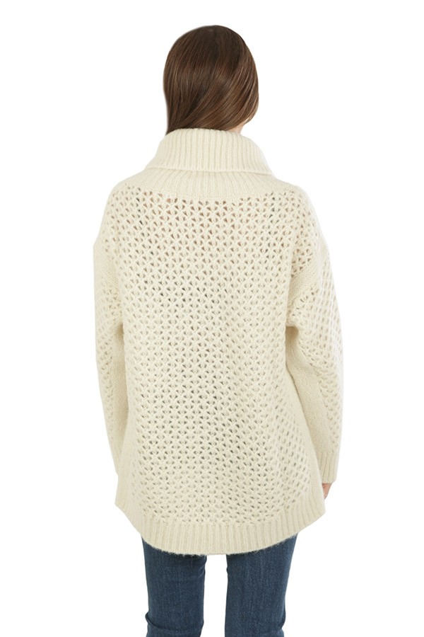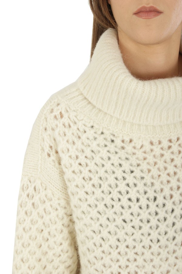 Malo sweater Art.DXC142 FYD05 E2887 made of milk-colored alpaca blend, turtleneck model with mesh knitting. Composition 68%wp 22%s and 10%wo. The model wears a size 42.