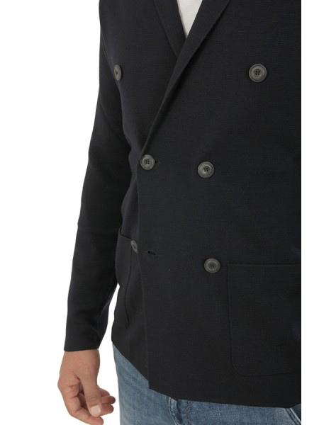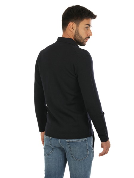 Sweater HINDUSTRIE Art.RJMLDPT WM14M 890 double-breasted cardigan model made of blue wool, patch pockets, slim fit. Composition 100%wv. The model wears size 48.