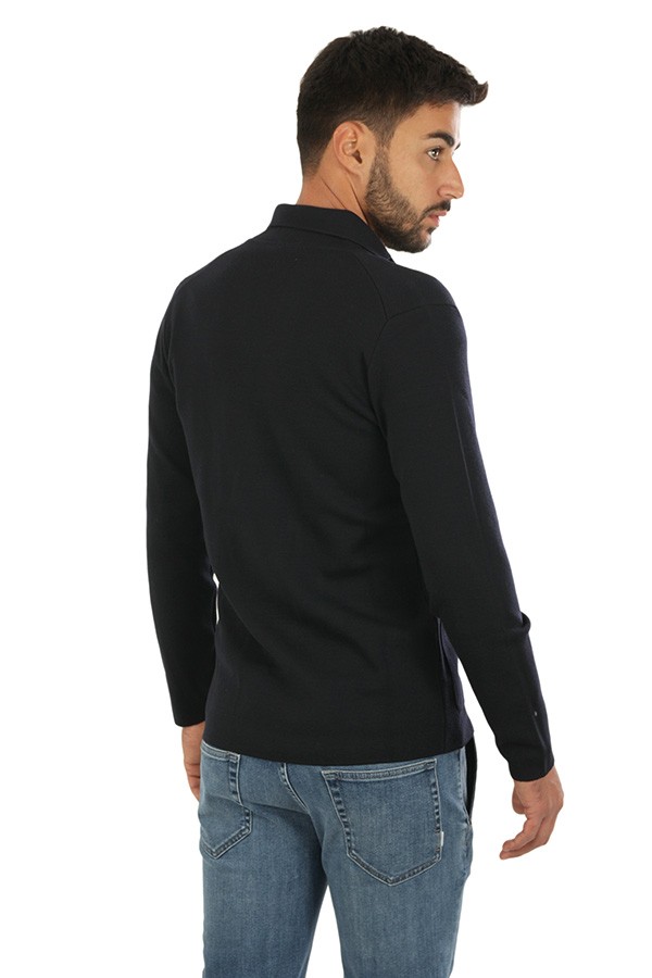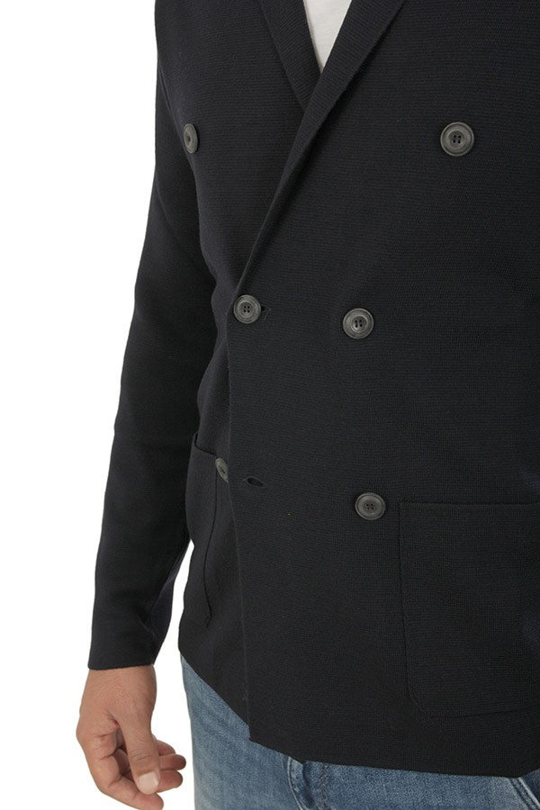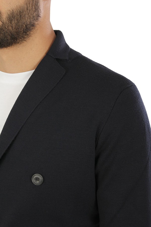 Sweater HINDUSTRIE Art.RJMLDPT WM14M 890 double-breasted cardigan model made of blue wool, patch pockets, slim fit. Composition 100%wv. The model wears size 48.