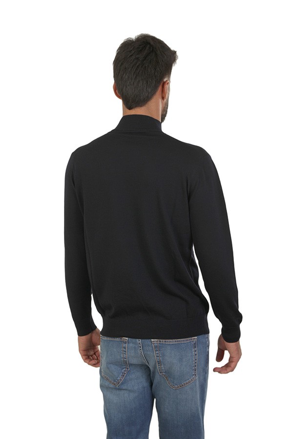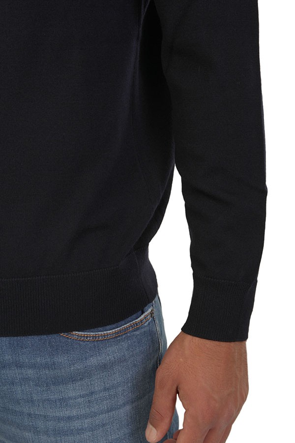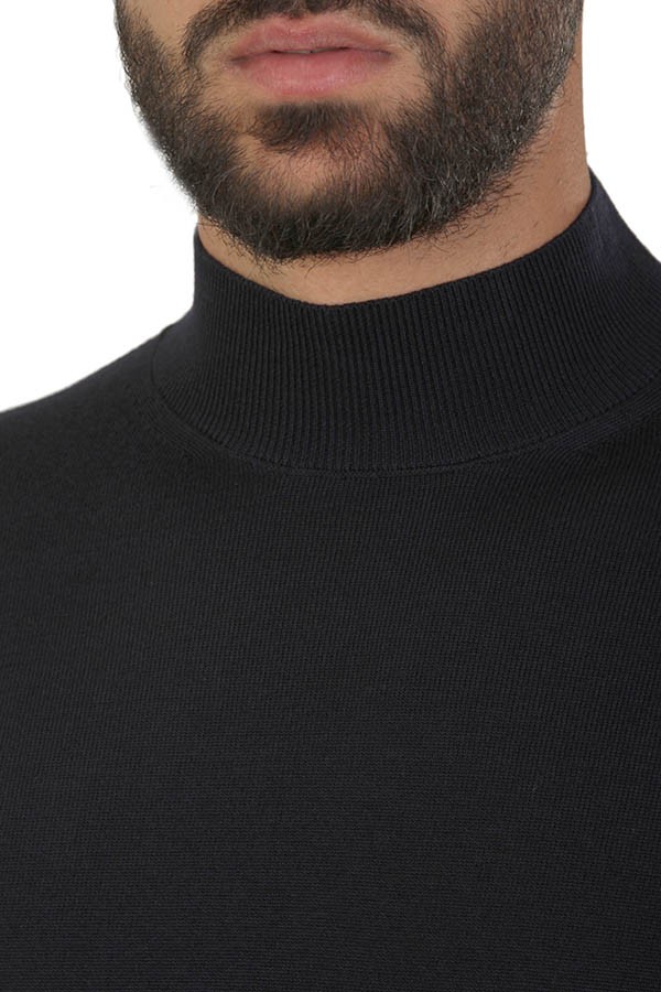 Turtleneck model, made of wool, in blue. Micro-ribbed edges and bottom.