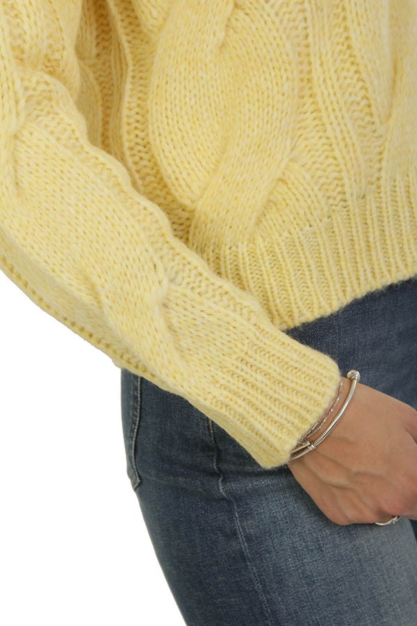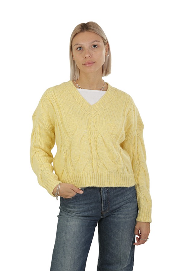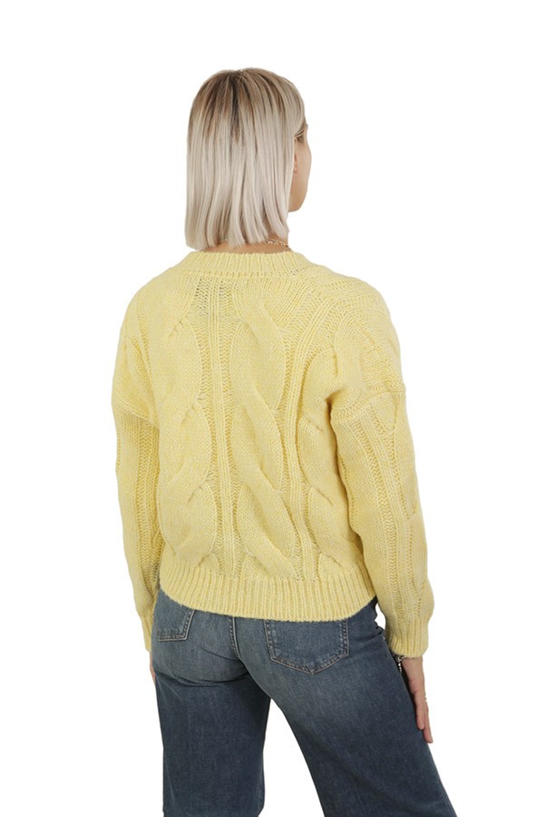 Made of soft alpaca yarn, with cable knitting. V-neck, dropped shoulders and ribbed trim.