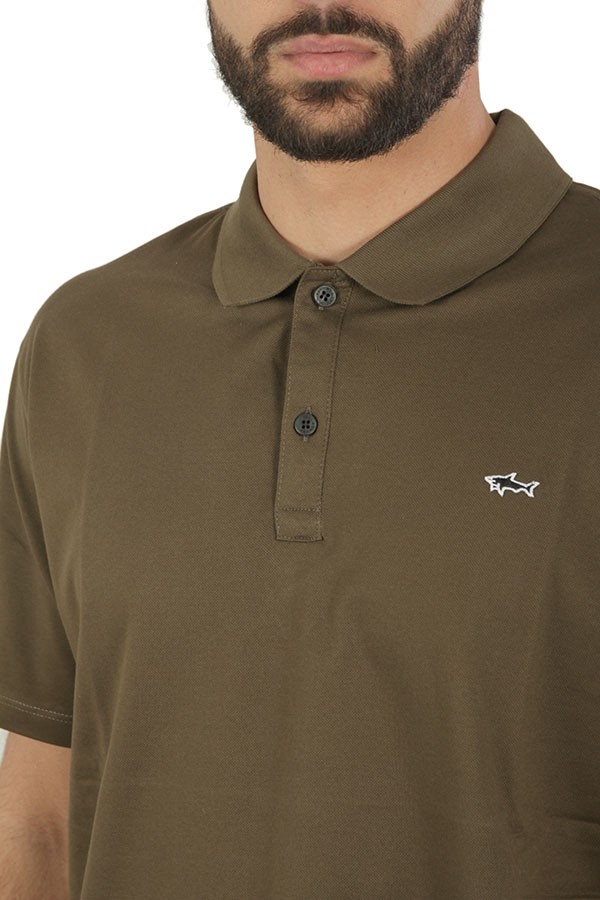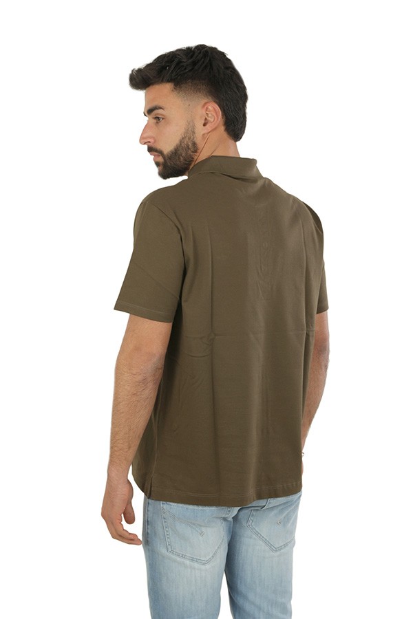 Made of pure cotton, short sleeves. Ribbed collar and logo on the chest. Button closure.