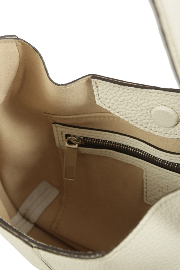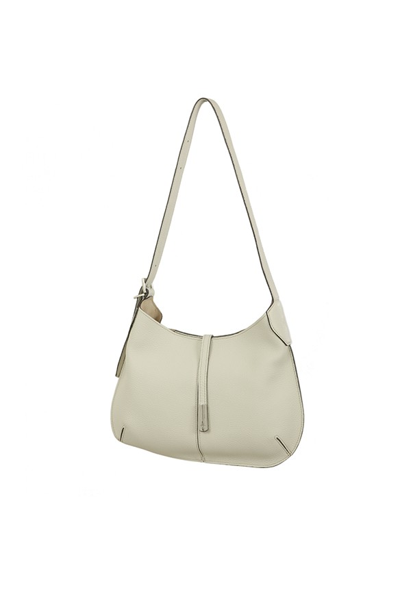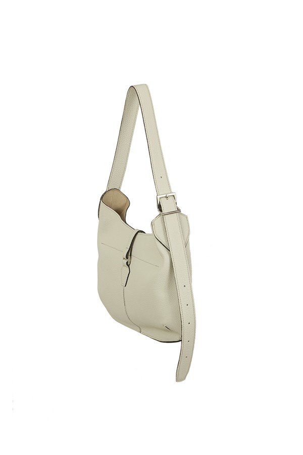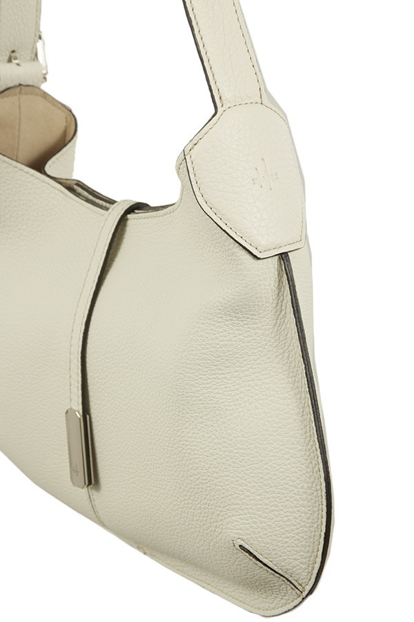 Made of hammered leather, with adjustable shoulder strap, and central detail. Magnet closure. Internal pocket with zip.
