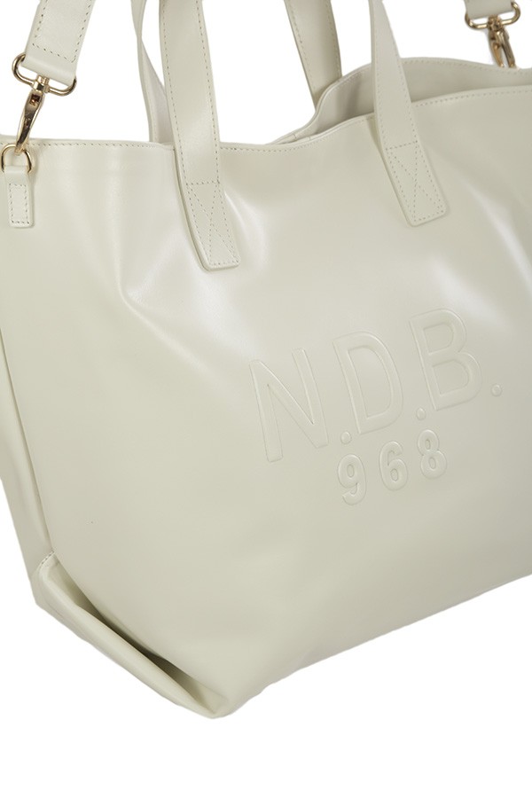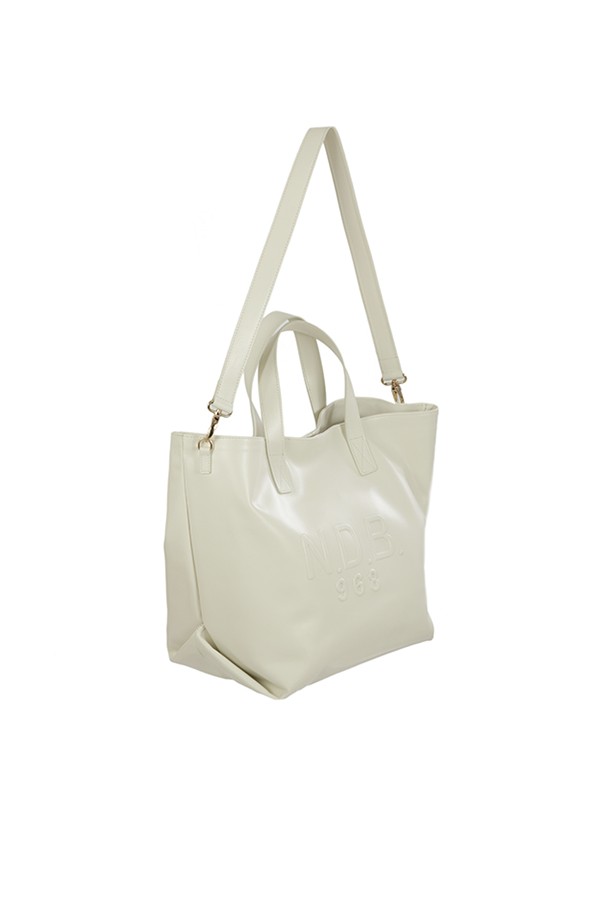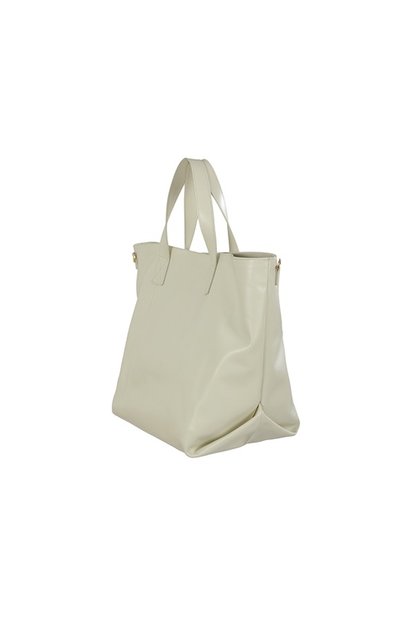 Shopper model, with shoulder strap. To be carried by hand or on the shoulder. With tone-on-tone front logo. Clip closure.