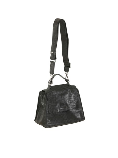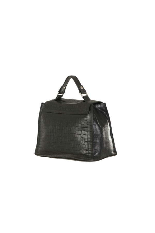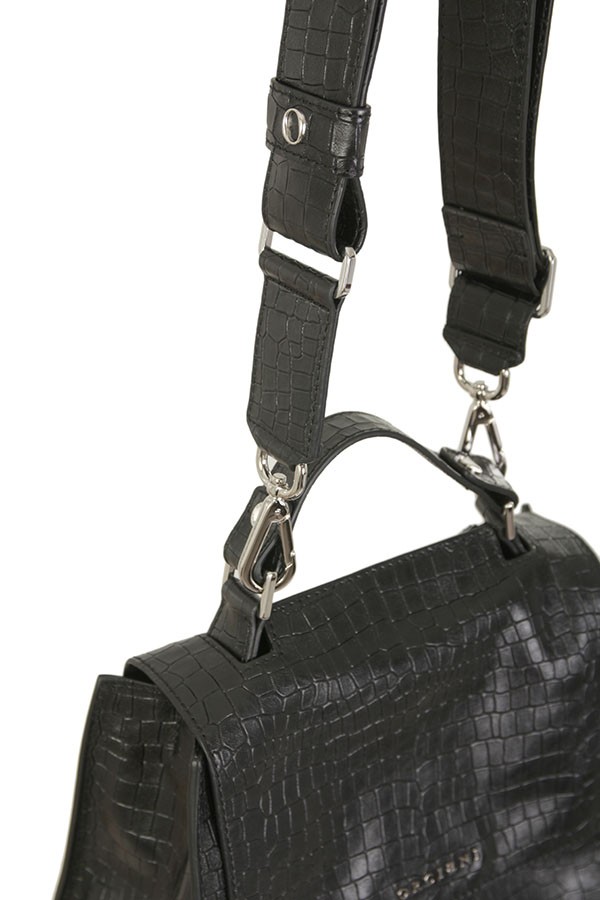 Made of leather, crocodile print. With front flap with magnet. To be carried on the shoulder or by hand. Three internal pockets, one of which is zipped.