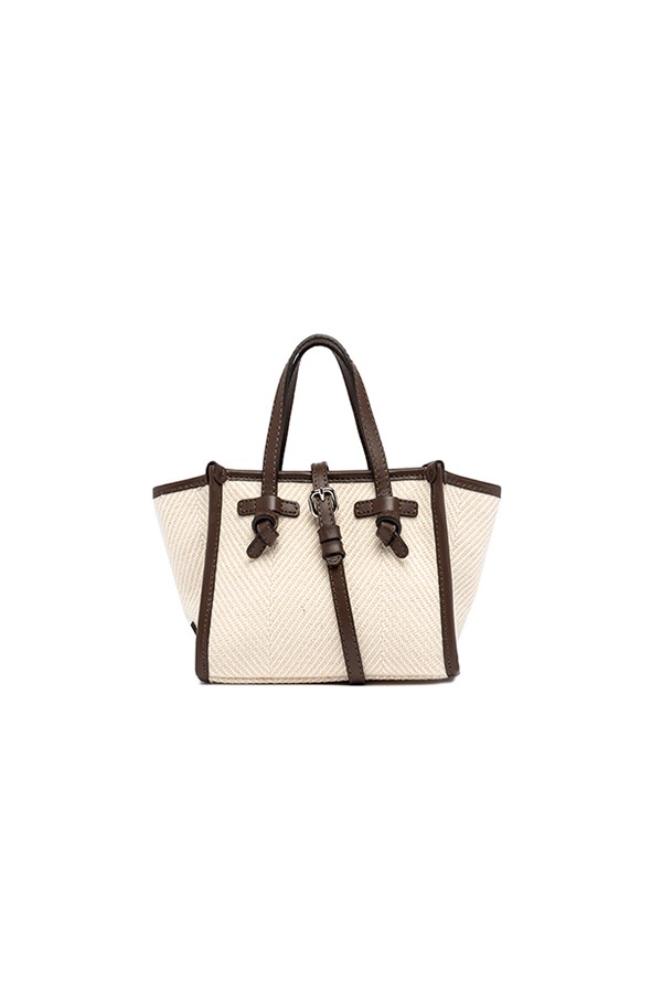 Made of herringbone fabric, with leather profiles and handles. Zip closure. To be carried by hand or over the shoulder.