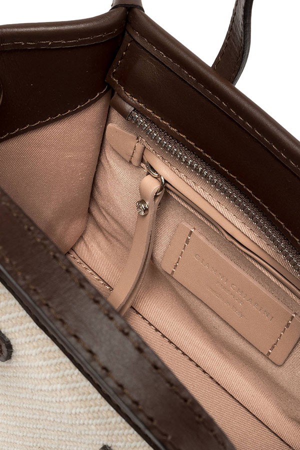 Made of herringbone fabric, with leather profiles and handles. Zip closure. To be carried by hand or over the shoulder.