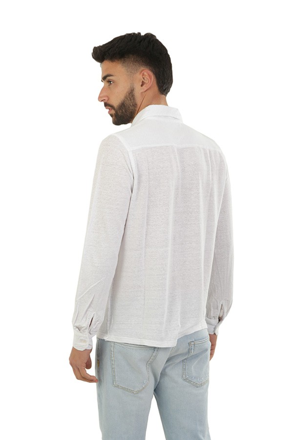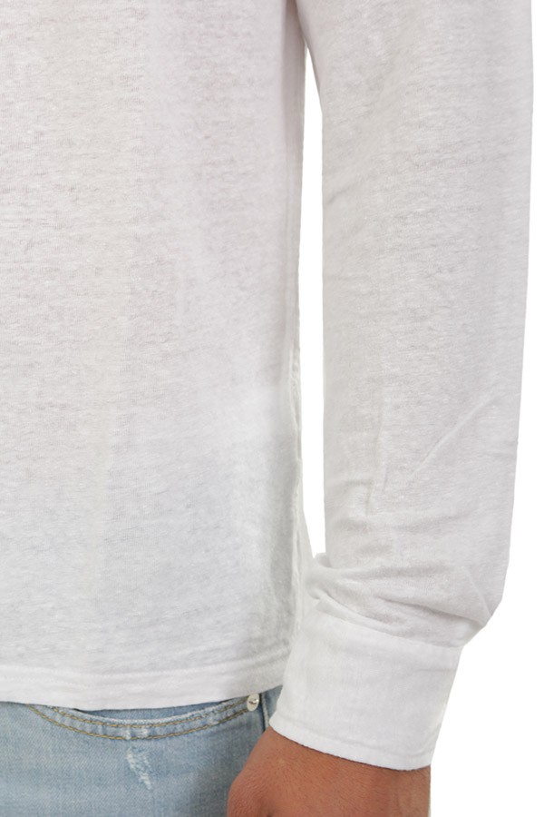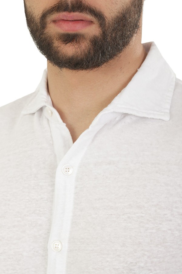 Jeordie's Poloshirt Art.80735 100 made of white linen, model with buttons and long sleeves. The model wears size 48.