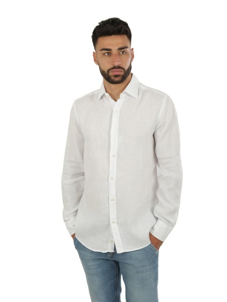 Characterized by the J-fit, straight line, with rounded hem. In pure linen, with a French collar. Small logo on the side.