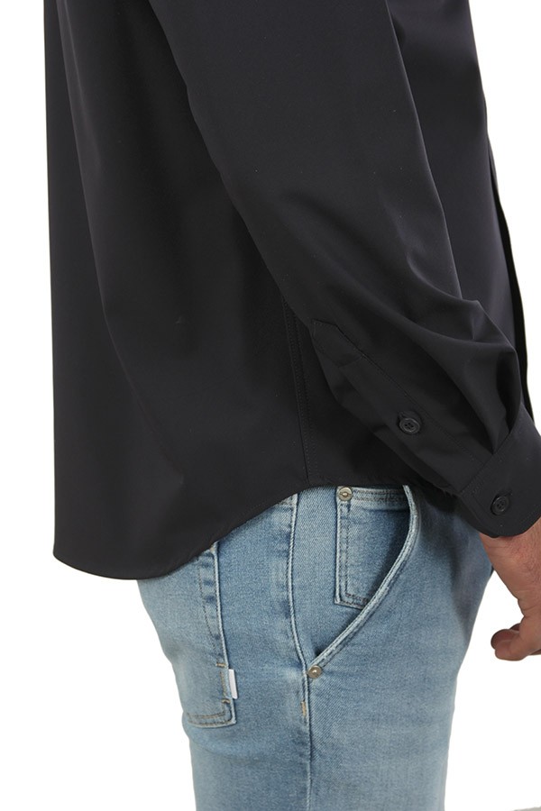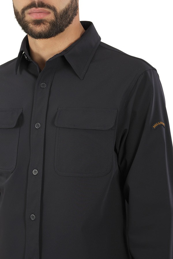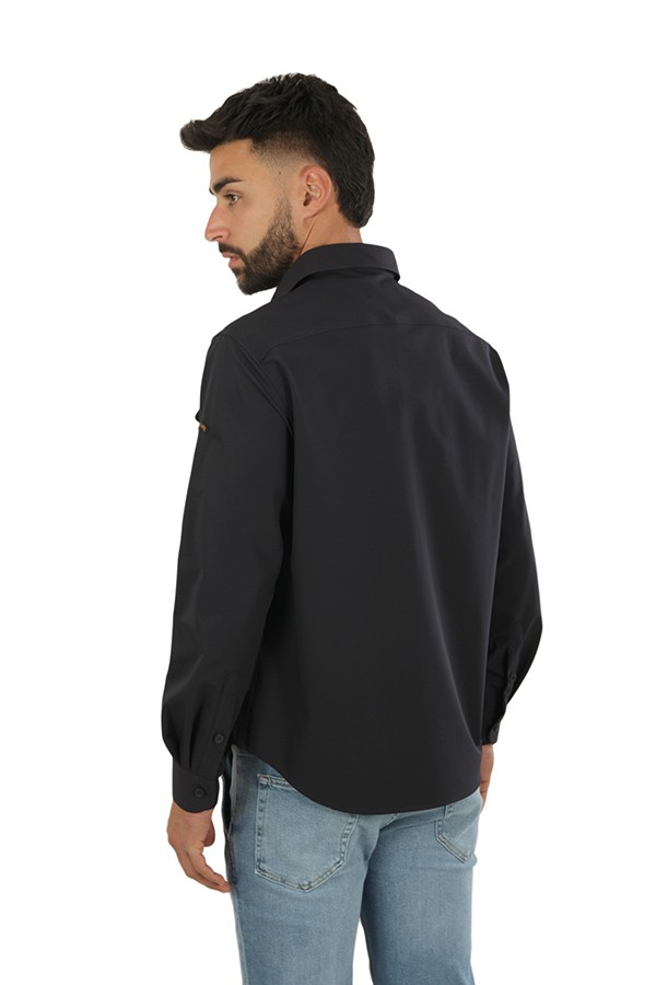 Straight line, with rounded hem. Patch pockets with flap, open collar. Logo on the arm.