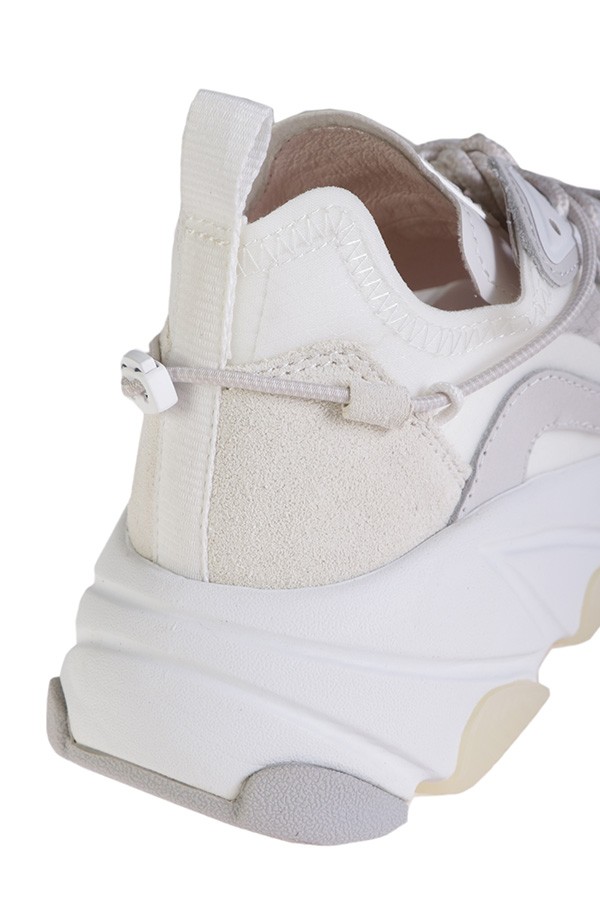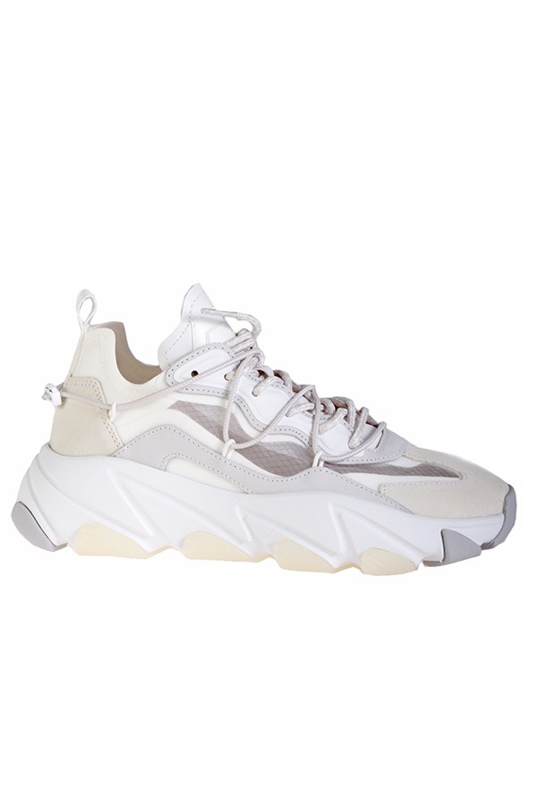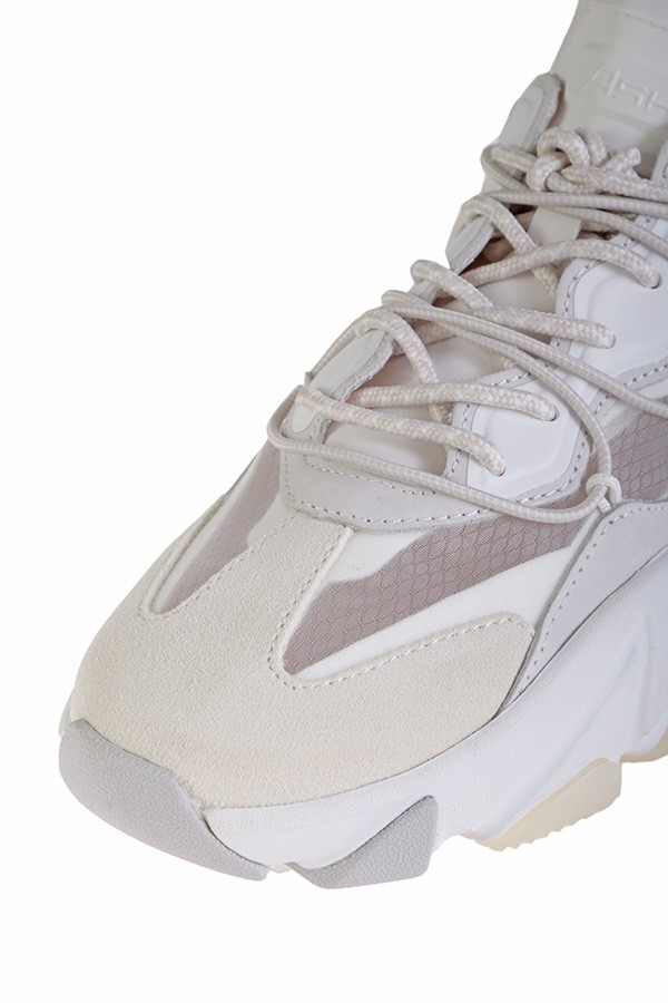 Ash Art.EXTRA BIS WHITE sneaker with white transparent fabric upper with leather finishes, stitched details and an elegant lacing system. Each color combination stands out in a unique way.