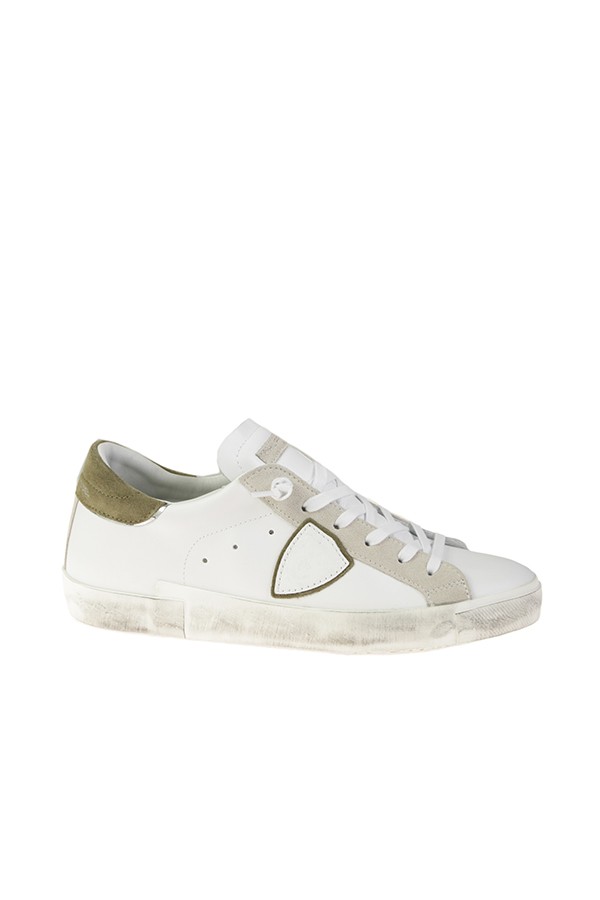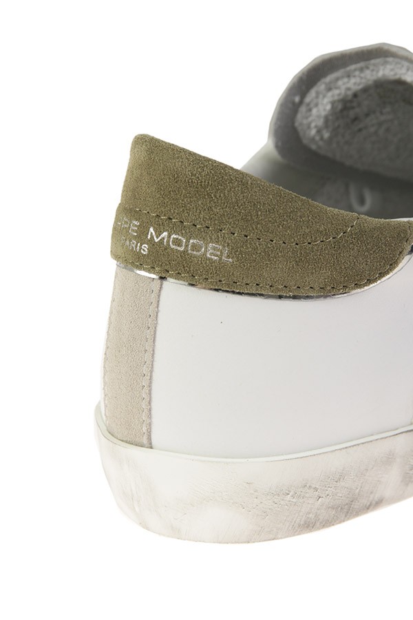 Philippe Model Art.PRLUVX 20 sneaker with upper made of calfskin and white suede with contrasting green inserts, tone-on-tone logo shield with vintage-effect dirt. The lace is white with a worn effect. The sole, 2.5 centimeters high, is made of brushed rubber with a vintage effect.