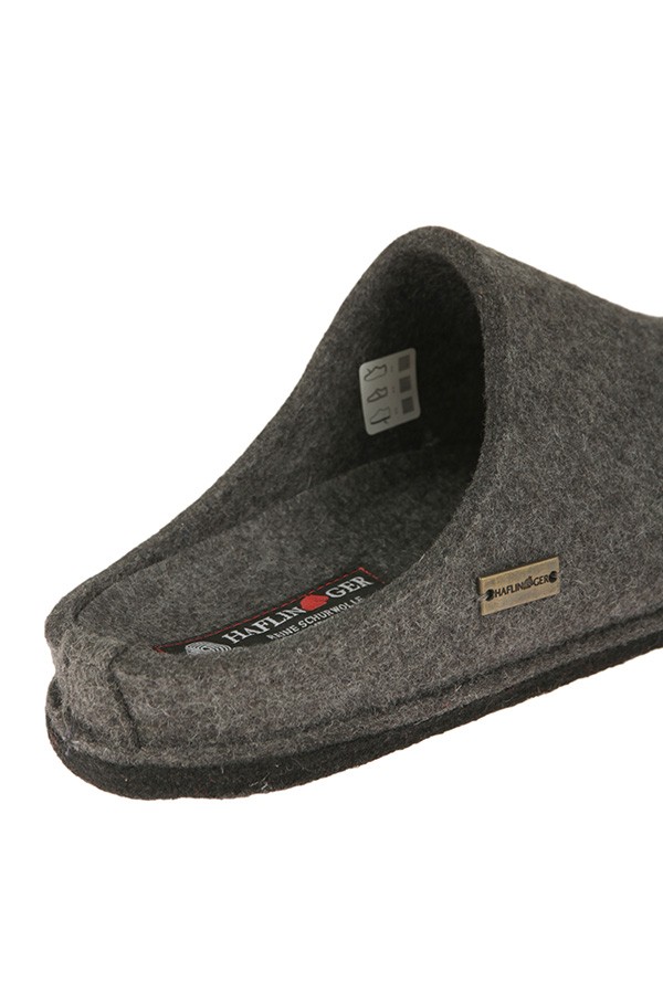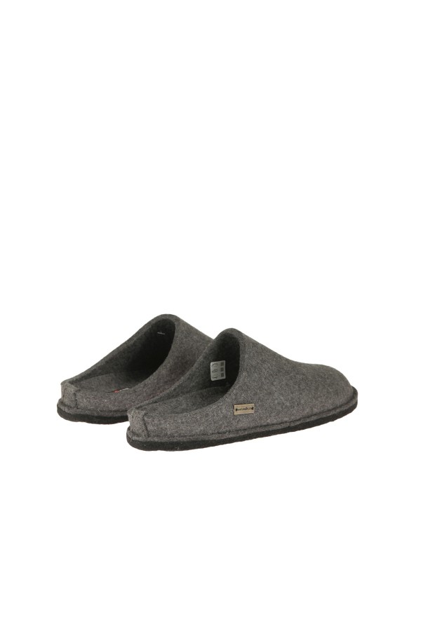 Haflin Gen Slipper Art.31101004 ANTHRACITE upper in felt or soft boiled wool of pure virgin wool anthracite color. The foot rests on an anatomical latex footbed, covered with wool or boiled wool felt. The felt sole is coated with latex to make it non-slip