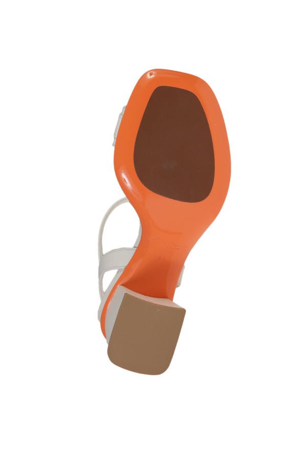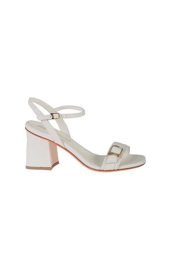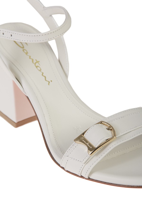 Made of leather, in White, with gold buckle on the front band. Ankle strap closure. Wide heel, 7.5cm high. Leather back.