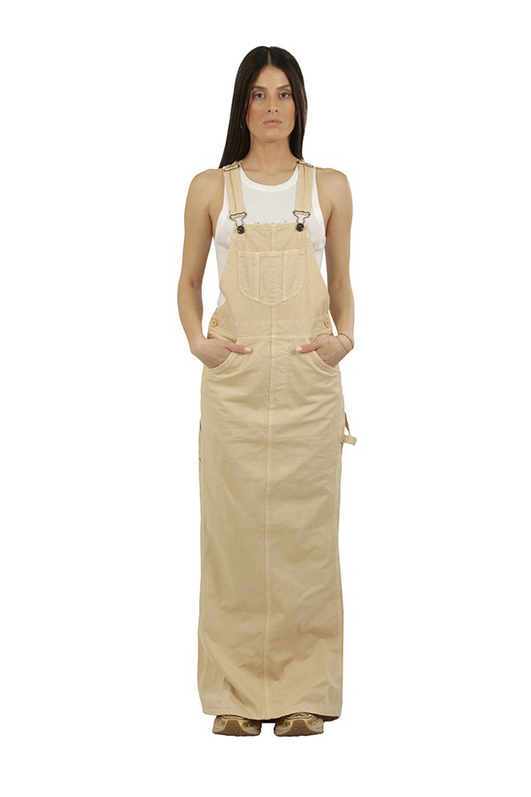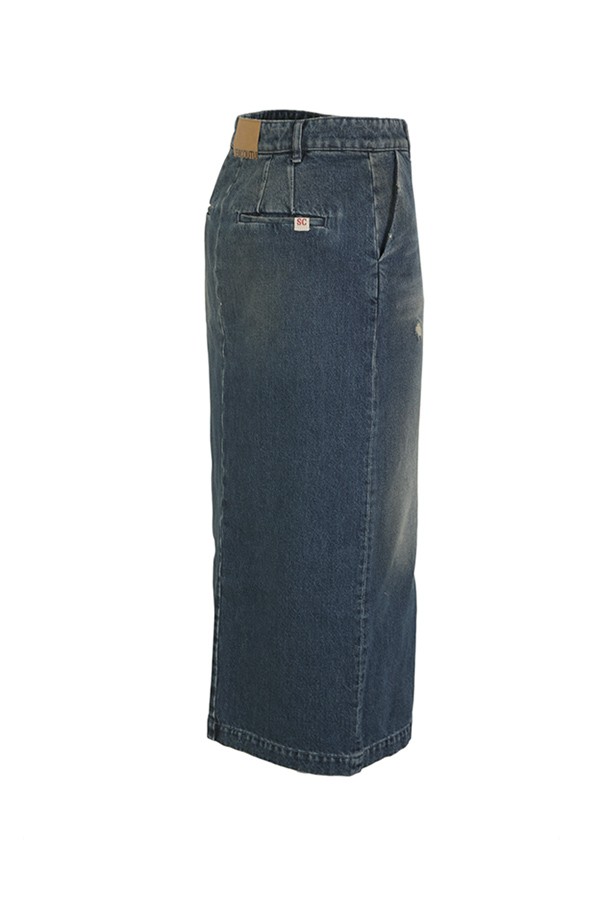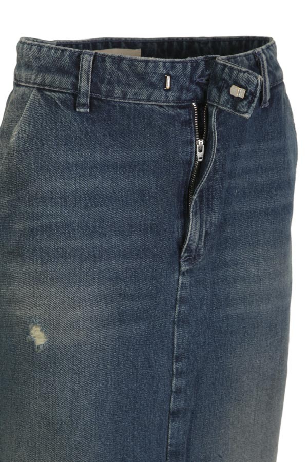 Frida. Long and tubular, in denim. Hook closure, and front slit. Snug fit.
