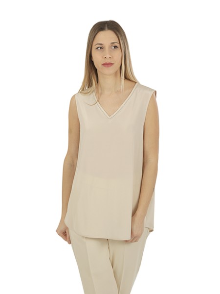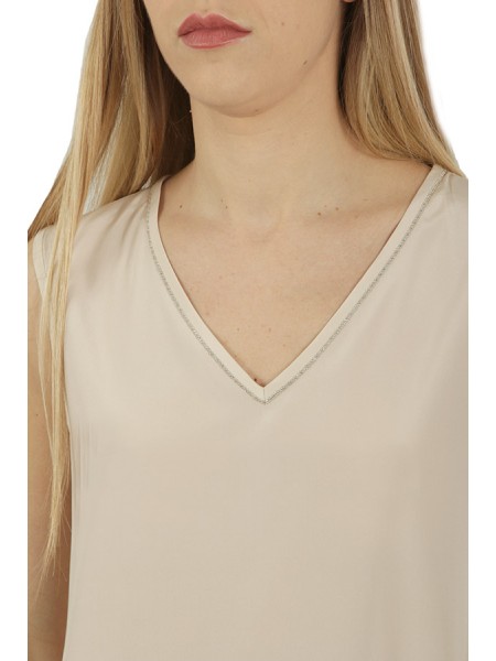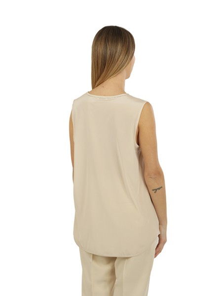 V-neck, sleeveless. in stretch silk. Light point on the neck. Regular fit.