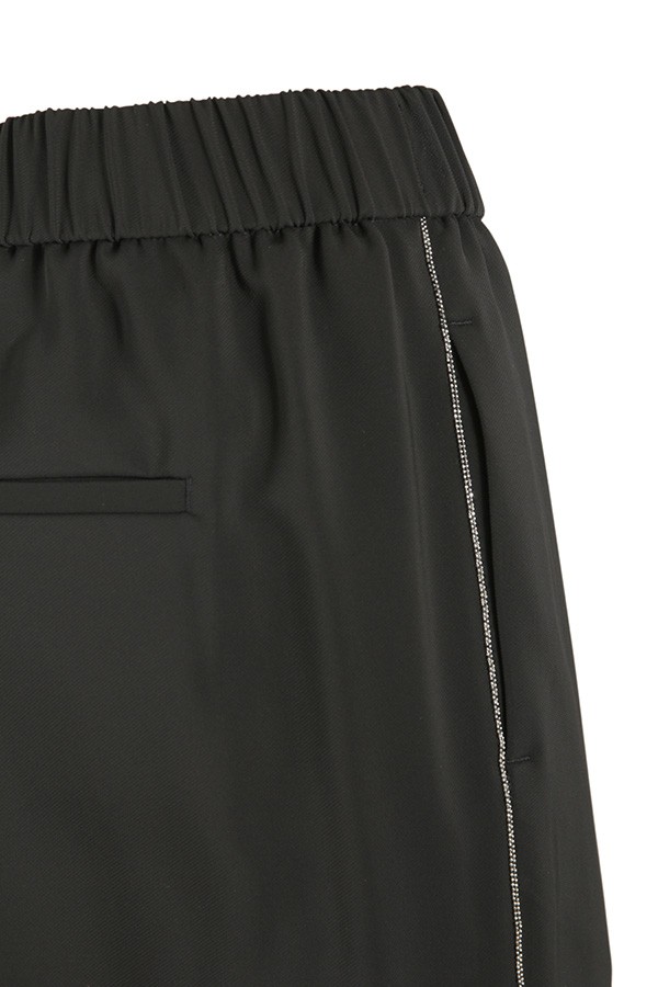In viscose cady, with elastic waistband. Front flush pockets, rear welt pockets.